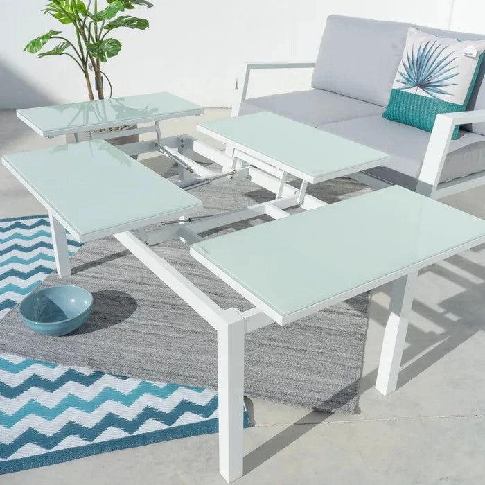 Agnes Aluminium 120 outdoor table, exclusive and original, with a modern and elegant design, with an aluminium structure and tempered glass table top, its straight lines give it a delightful modern personality, ideal for all types of terraces and gardens.