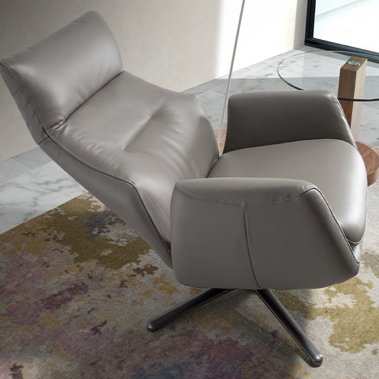 Swivel reclining armchair with modern design arms and seat and back upholstered in dark grey cowhide. Both for its style and its black stainless steel legs, this armchair is the perfect combination of design and comfort.