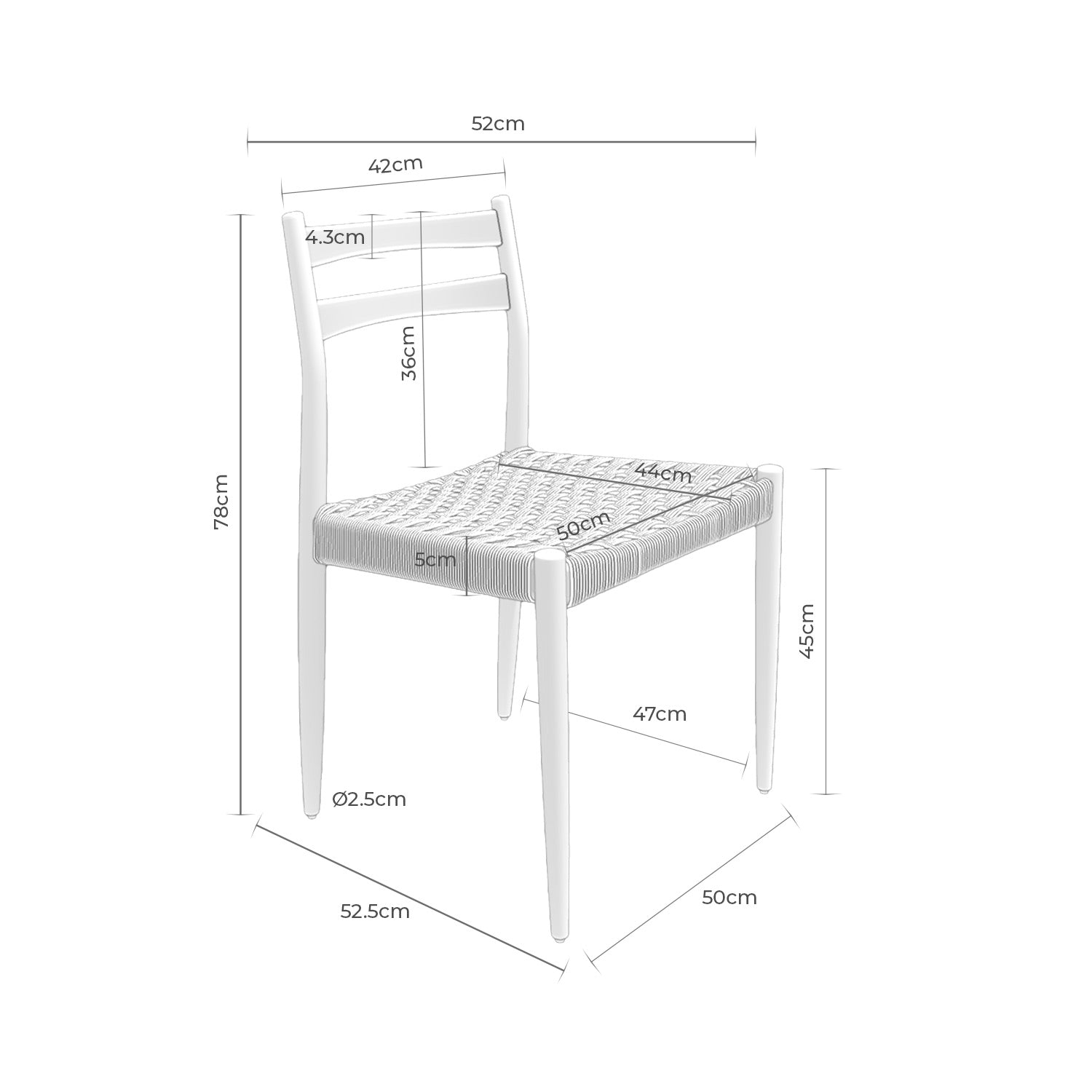Its structure is made of lacquered oak wood, which gives it strength, durability, and a touch of timeless elegance. On the other hand, the rope-woven seat creates a balanced visual contrast, providing warmth, craftsmanship, and a cozy character to the design.
