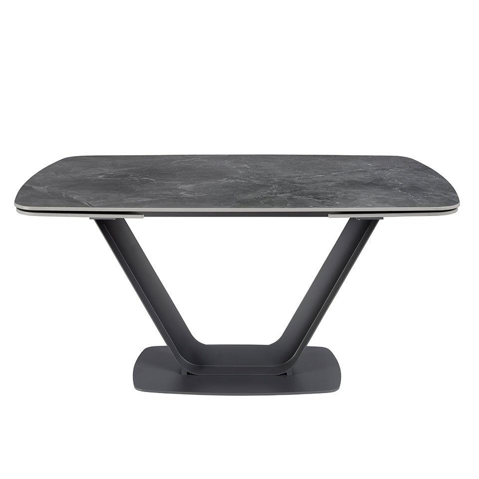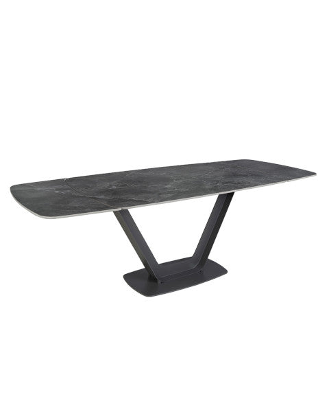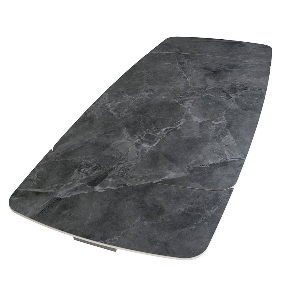 Modern design extendable oval dining table with black porcelain marble top with grey veins in a matt finish.