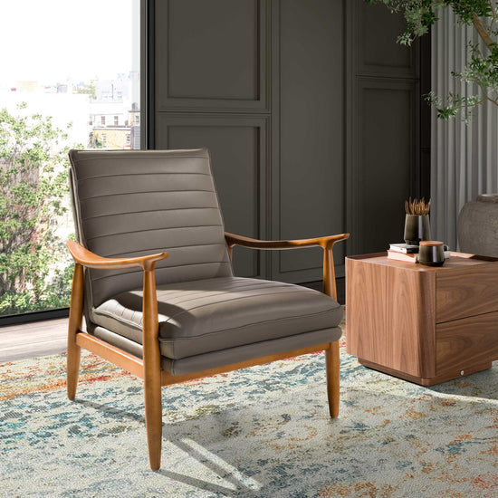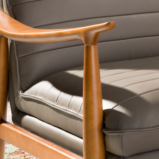 Modern design armchair with arms and seat and back upholstered in dark grey cowhide. Both its style and its honey-coloured wooden legs make this armchair the perfect combination of design and comfort.