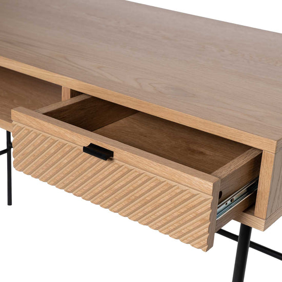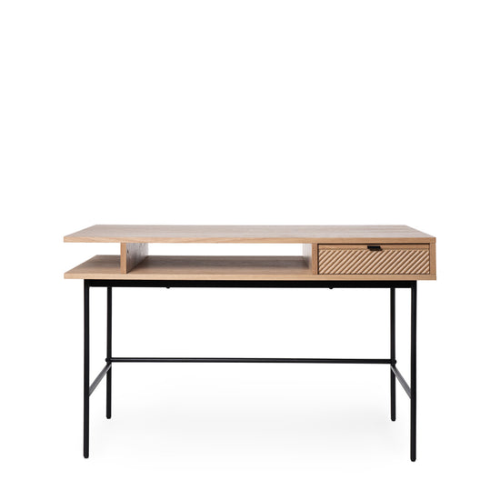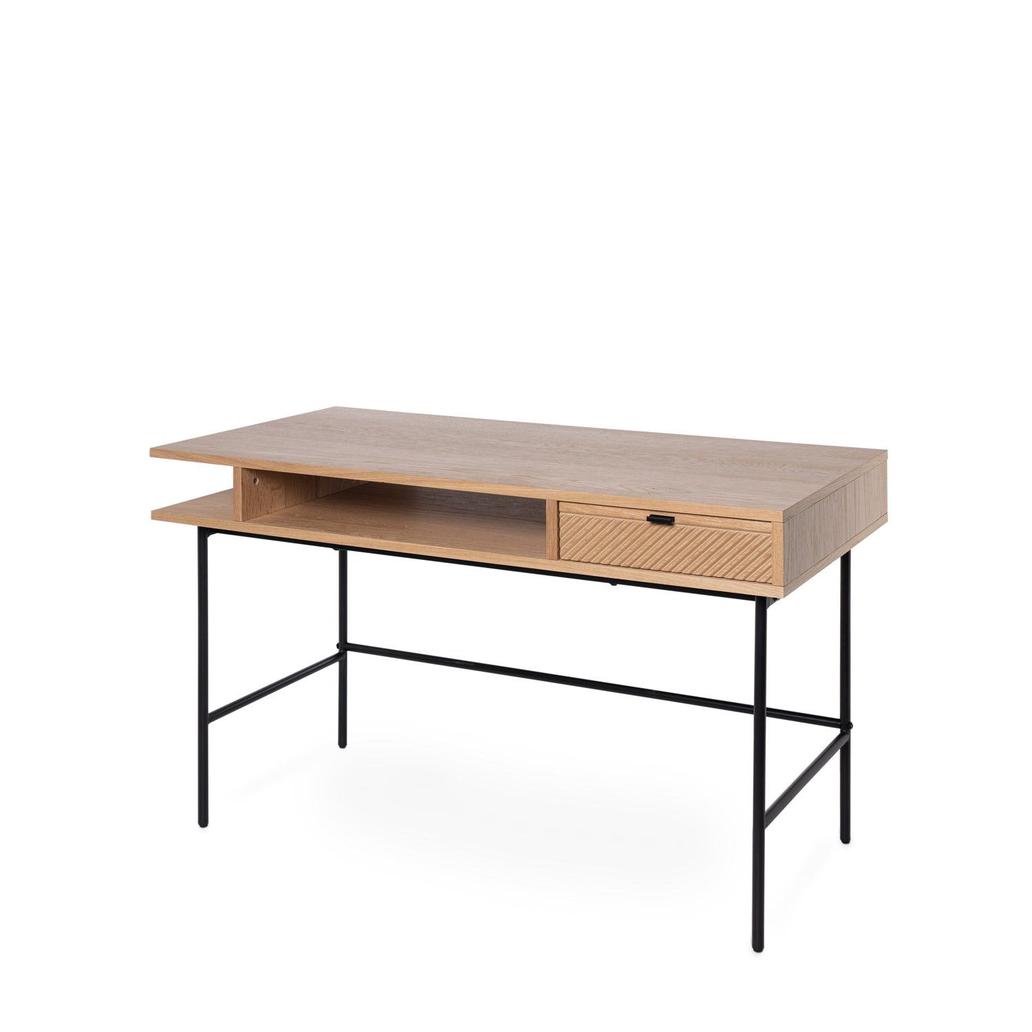 The ALABAMA desk stands out for its contemporary design and remarkable versatility, making it the perfect complement to enhance modern and elegant spaces with impeccable functionality. Crafted from oak and complemented by metal legs in a sleek black finish, this piece combines a sober aesthetic with a timeless character. Its clean, balanced design allows it to easily integrate into a wide variety of decorative styles, ranging from industrial to minimalist, adding a touch of understated sophistication. The ALABAMA desk offers a large work surface, ideal for both professional and creative tasks, ensuring comfort and efficiency. Additionally, it includes a practical integrated drawer with space-saving storage, providing additional storage to keep all utensils and documents organized and within reach.