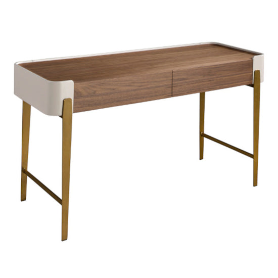 Alaska desk in walnut, beige and polished gold steel with a modern design, made of natural walnut veneered wood and beige lacquered MDF.