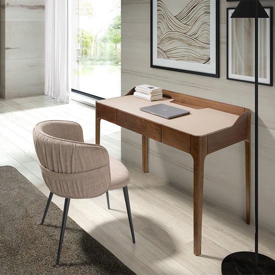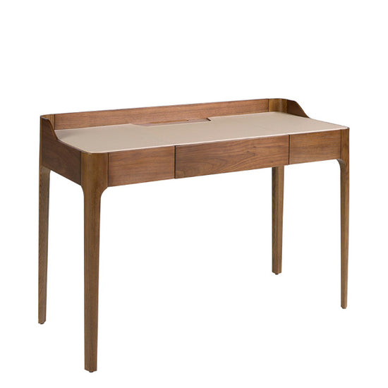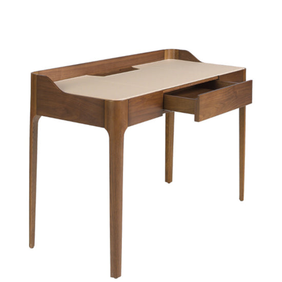 Modern design desk in natural walnut veneer wood, combined with elegant cream-colored leather upholstery.
