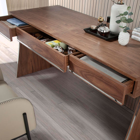 Florida desk with a modern design in natural walnut veneer. The design of its natural walnut veneer legs will add a sophisticated and unique touch to your room.