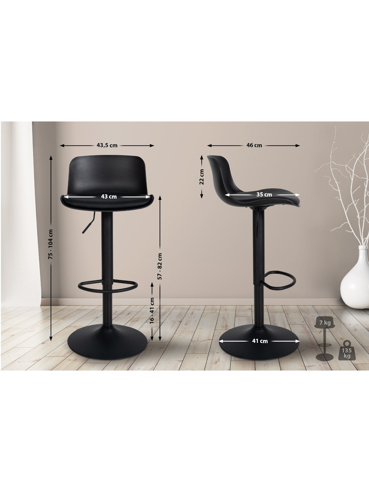 The stool's attractive design is complemented by the use of durable synthetic leather and a 360-degree swivel metal base. This base is not only visually appealing but also protects delicate floors thanks to its careful construction.
