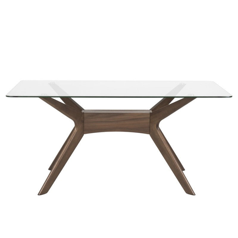 1 cm rectangular tempered glass table measuring 140x90cm with structure and legs in hevea wood with oak or walnut finish.