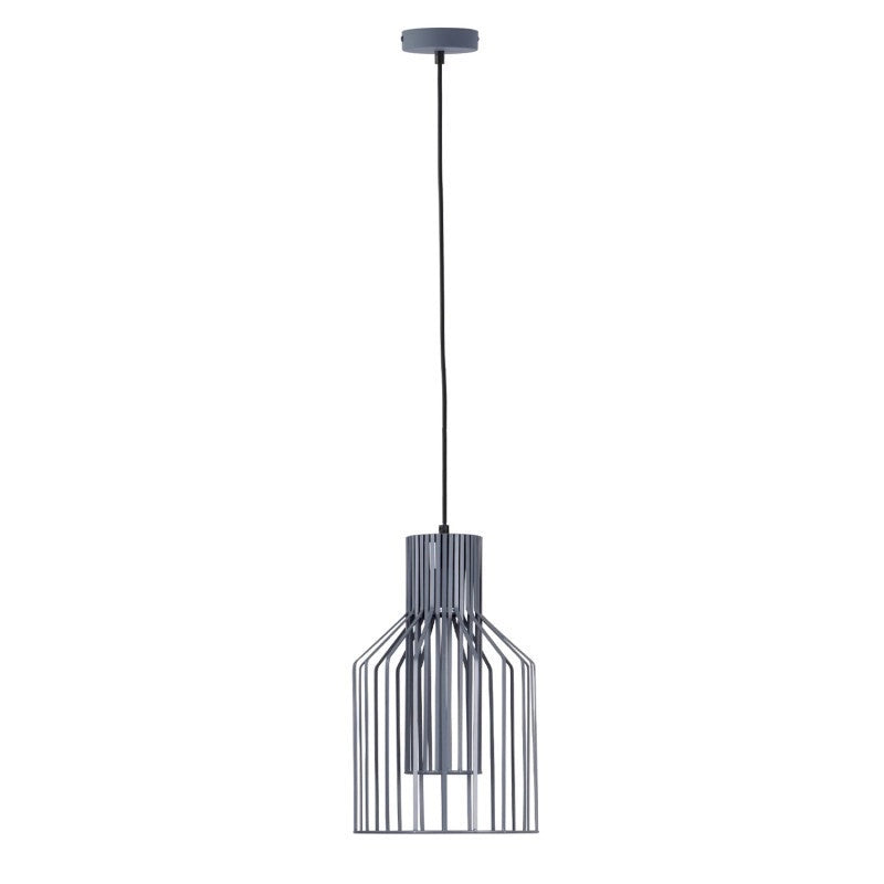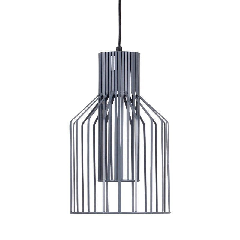 The center of the lamp is made up of two bodies. The first one surrounds the bulb with tightly fitting dark gray metal strips. This will make the light focus on the ground thanks to its tube shape.