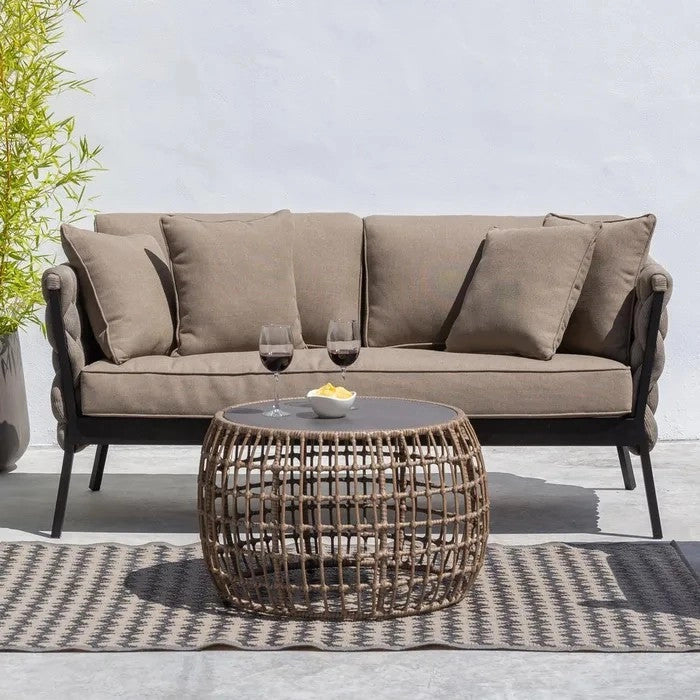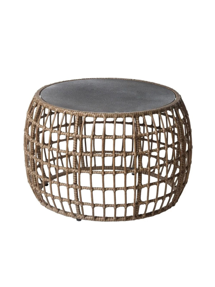 Ariki outdoor coffee table, exclusive and original, with a modern design, with a steel structure with a black epoxy finish, rattan weave and 5mm tempered glass.