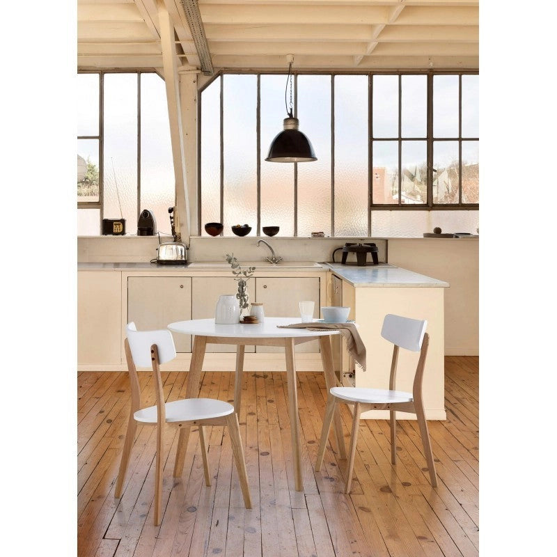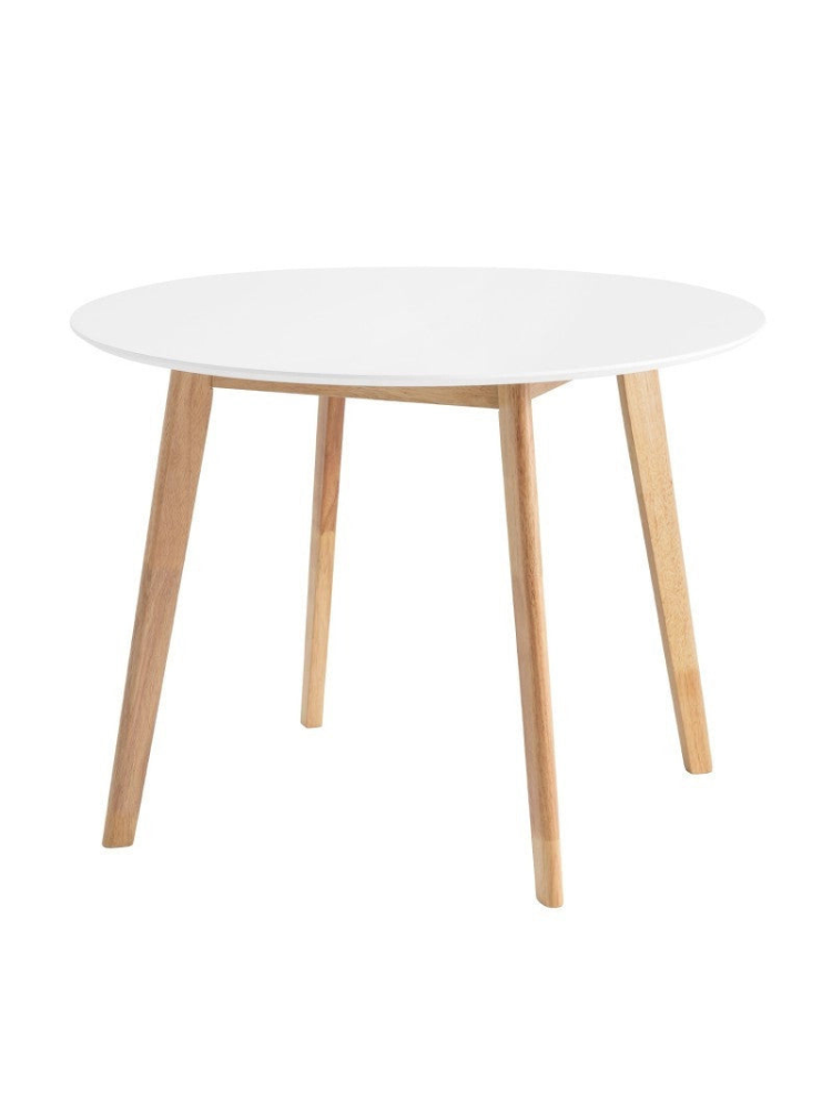 Round wooden table with 100cm diameter. Beech wood legs and fixed white lacquered top with 18mm thickness.