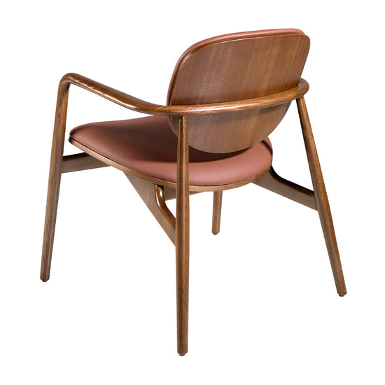 Modern design armchair with armrests and seat and backrest upholstered in brown synthetic leather. The elegant walnut-coloured wood finish provides the avant-garde and distinguished touch you are looking for in your home. Both its style and its walnut-coloured wooden legs make this armchair the perfect combination of design and comfort.