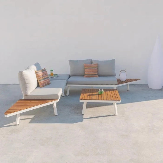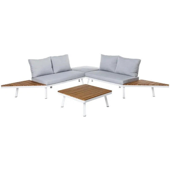 Saskia Aluminium outdoor sofa, exclusive and original, with a modern design, with a matt white aluminium structure, with side tables on both sides of the sofa in solid acacia wood and grey cushions.