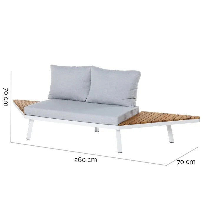 2-seater sofa in aluminium 260 x 70 x 70 cm, with aluminium frame in matt white colour, with side tables on both sides of the sofa in solid acacia wood and 12 cm grey cushions with removable covers, 100% Polyester.