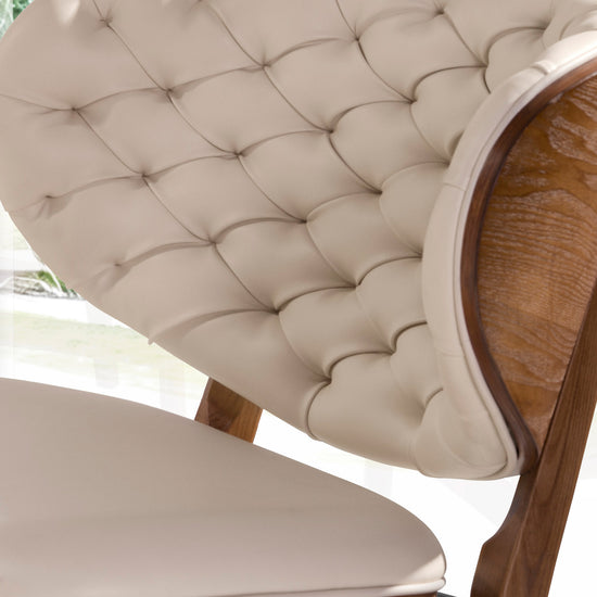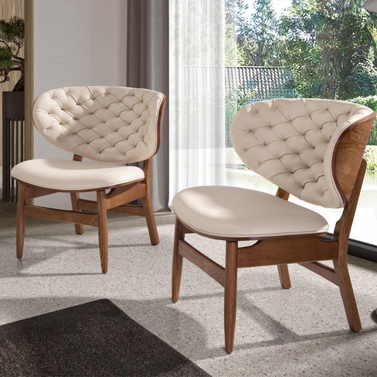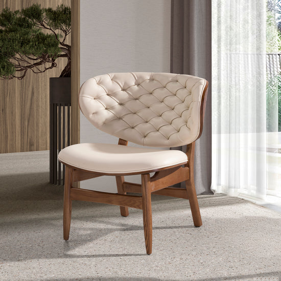 Modern design armchair with seat and back upholstered in cream-colored synthetic leather. With its natural walnut veneered wood details and walnut-colored wooden legs, this armchair is the perfect combination of design and comfort.