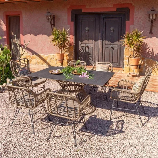 Conjunto compuesto por: 1 Mesa 150x120x71,5 cm y 6 Sillones de exterior Ariki 63x67x97 cm