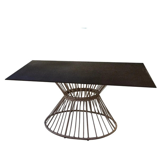 Mesa con estructura de acero con acabado epoxi negro y mimbre trenzado.
