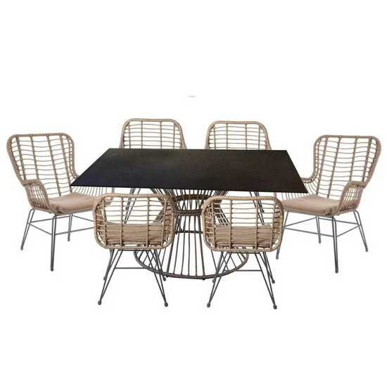 Este conjunto de comedor consta de 1 mesa de 150 x 120 x 71,5 cm y 6 sillones de exterior Ariki de 63 x 67 x 97 cm.