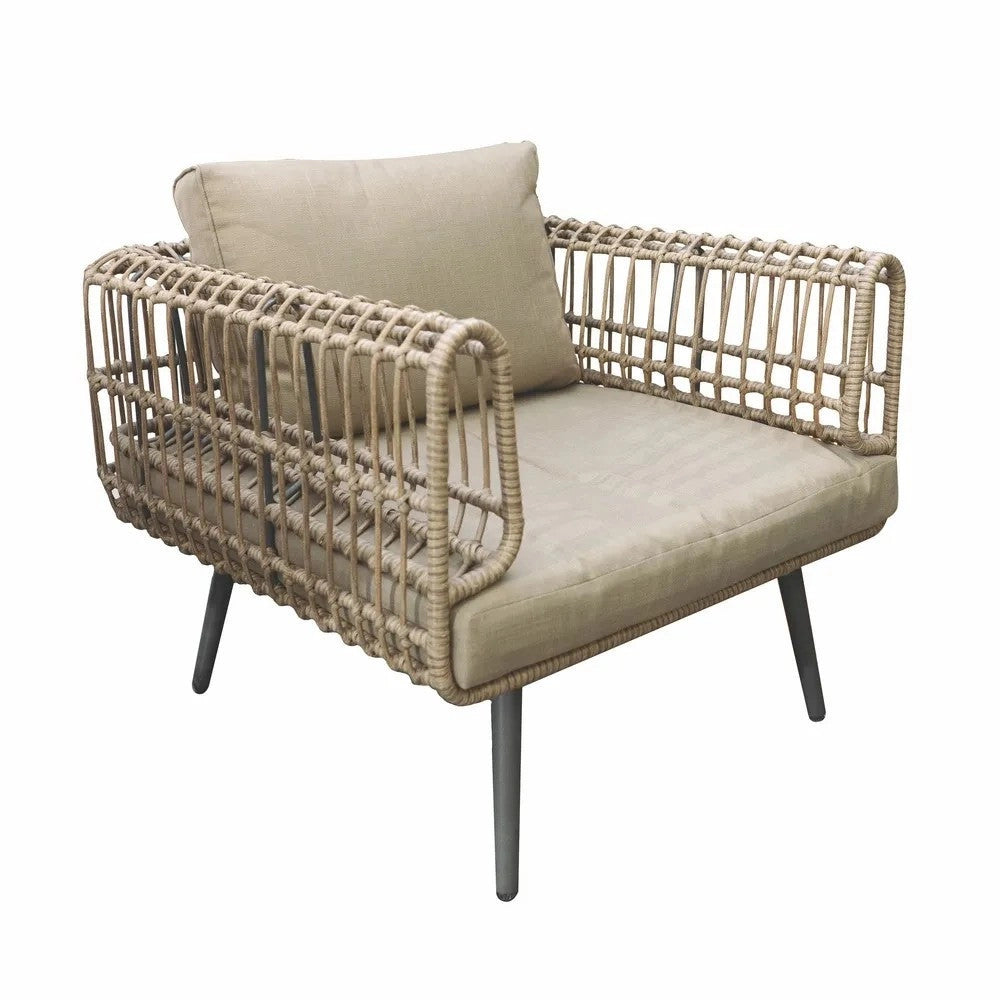 Conjunto de exterior Ariki, exclusivo y original, de diseño moderno, con estructura de acero y acabado en epoxi negro y cojines en color topo.