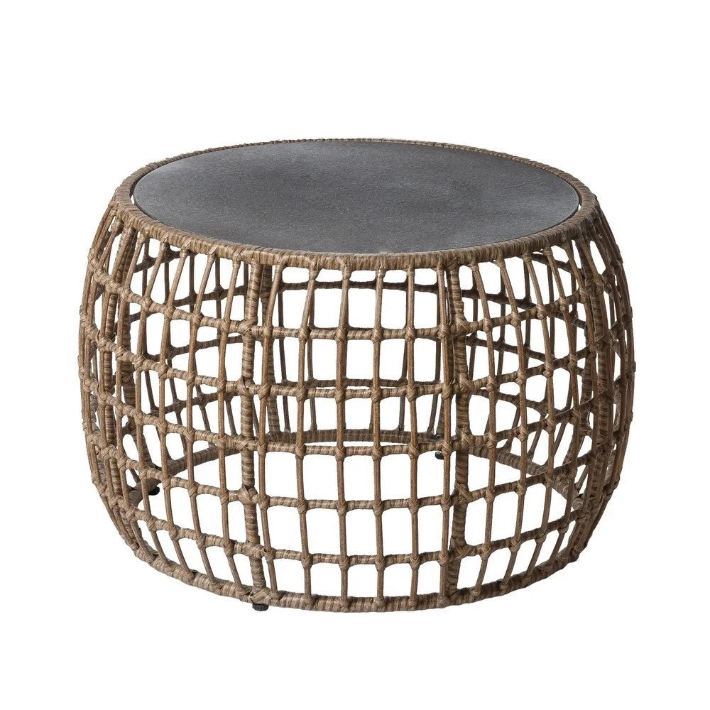 1 Mesa de centro Ariki 73 X 61 X 46, estructura de acero con acabado epoxi negro y mimbre tejido. Vidrio templado de 5 mm.