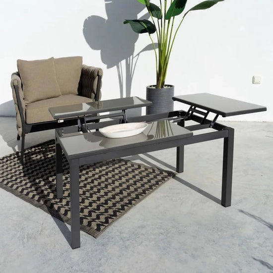 Mesa de exterior Agnes Aluminio 100, exclusiva y original, con un diseño moderno y elegante, con estructura de aluminio y tablero de cristal templado, sus líneas rectas le confieren una encantadora personalidad moderna, ideal para todo tipo de terrazas y jardines.