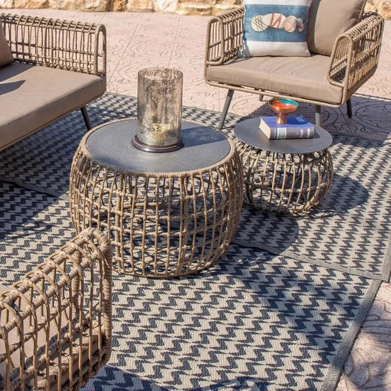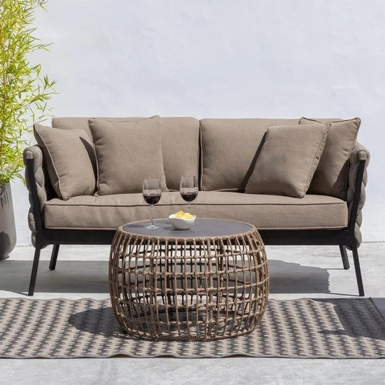 Mesa de centro de exterior Ariki, exclusiva y original, de diseño moderno, con estructura de acero con acabado epoxi negro, tejido en rattan y cristal templado de 5mm.