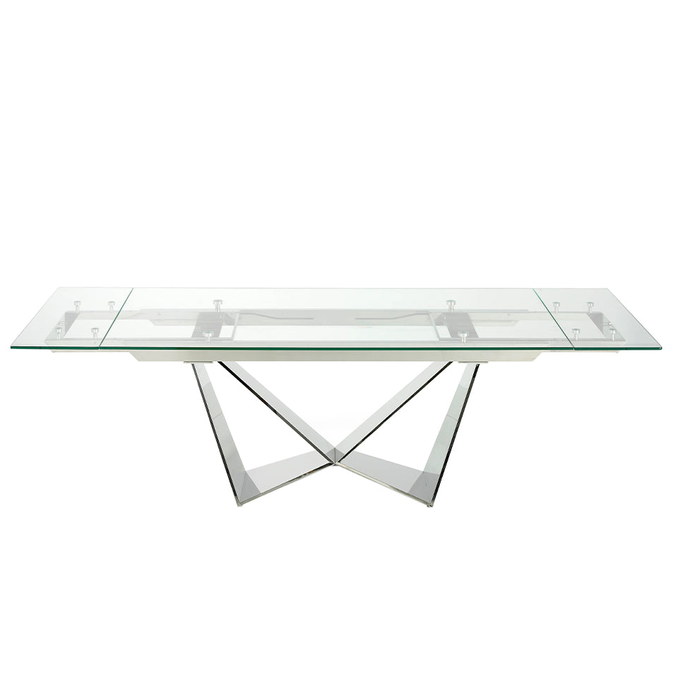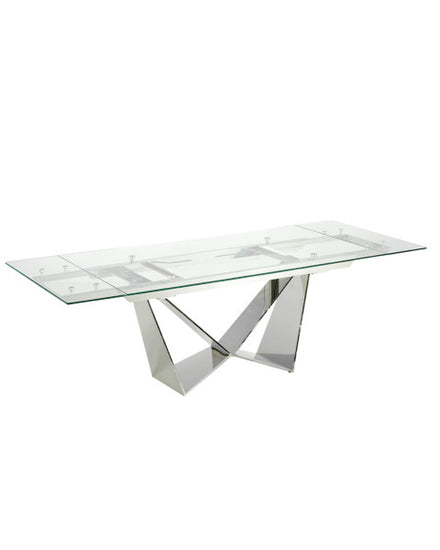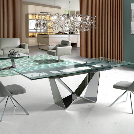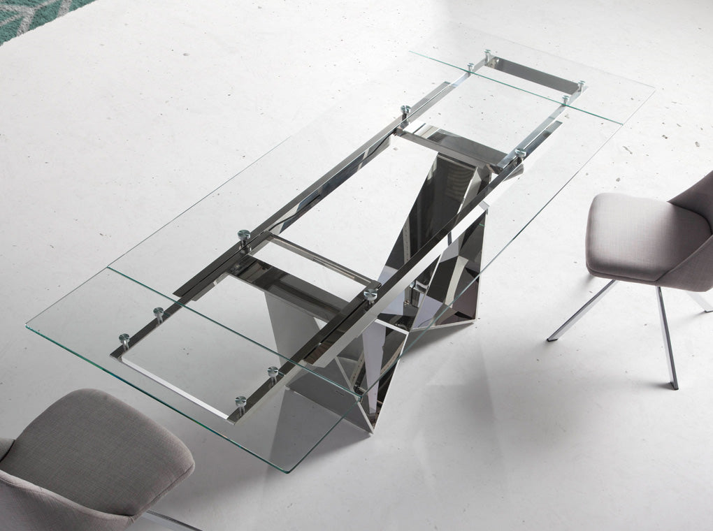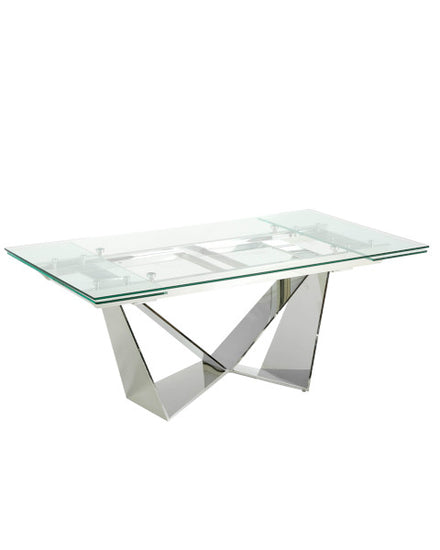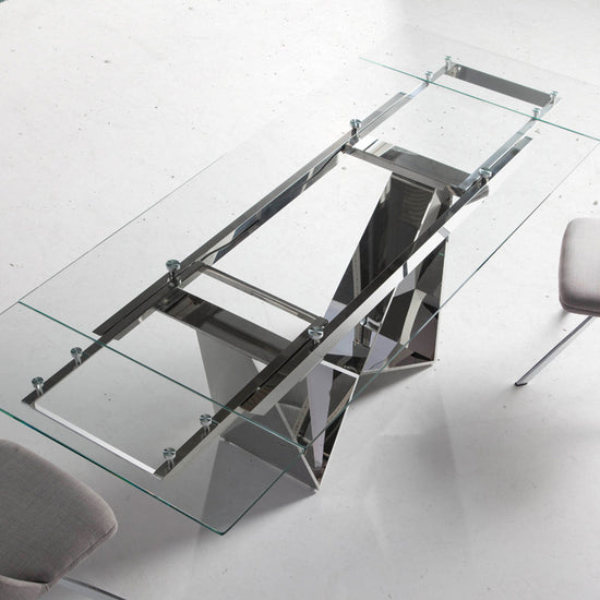 Mesa de comedor extensible rectangular de diseño moderno con tapa de cristal templado. Sus patas de acero inoxidable cromado y su adaptabilidad lo convierten en un mueble totalmente funcional y versátil para el uso diario.