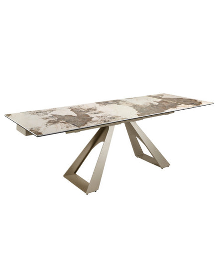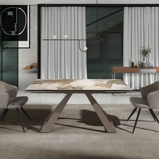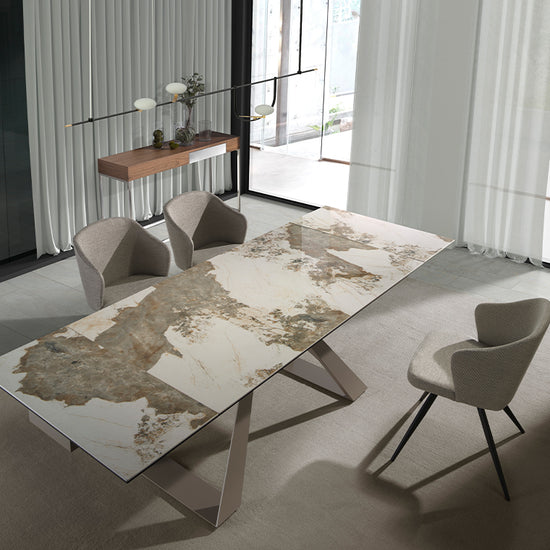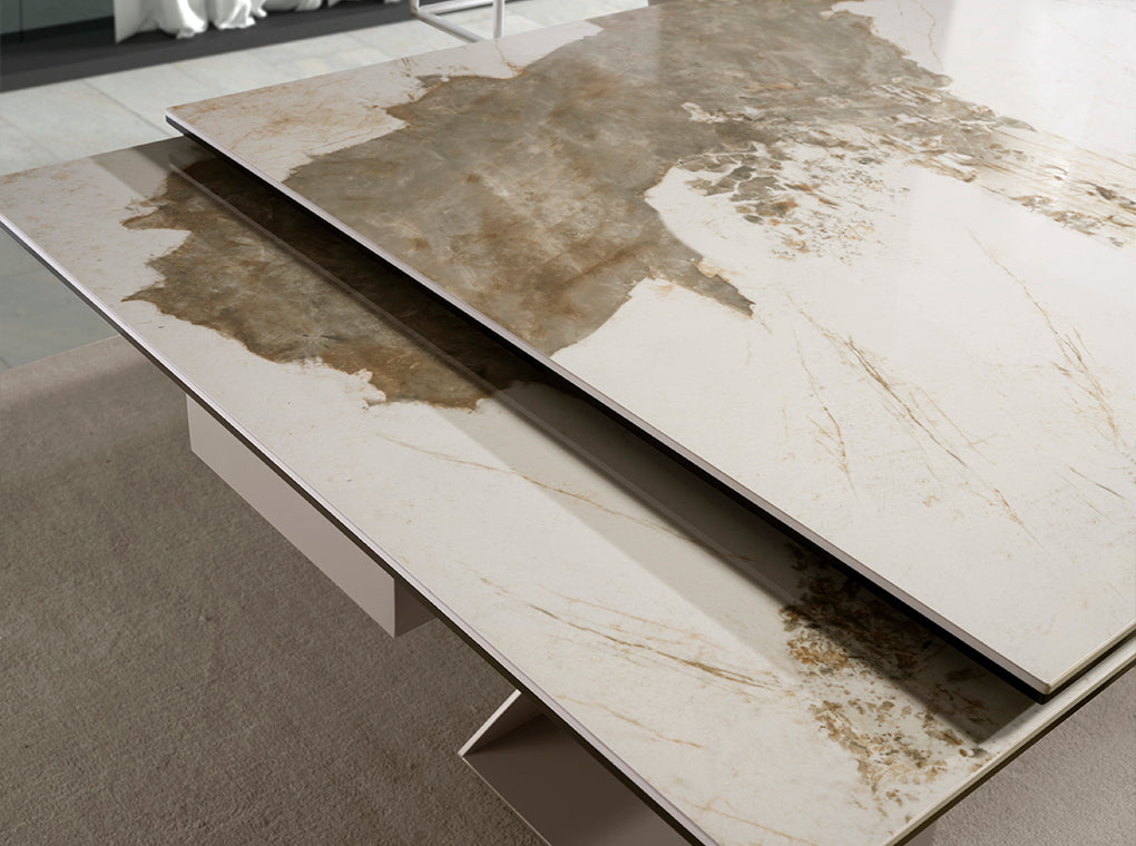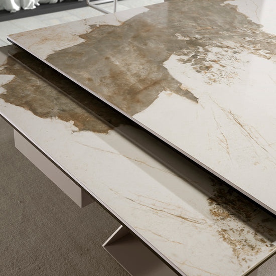 Mesa de comedor extensible rectangular de diseño moderno con tapa de mármol porcelánico blanco con vetas en tonos tierra y acabado brillo.