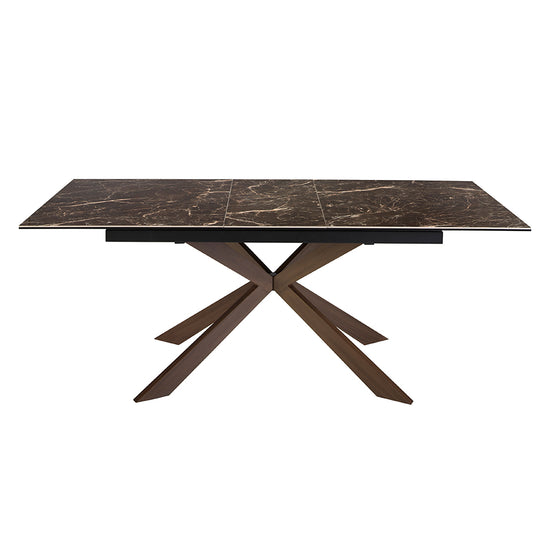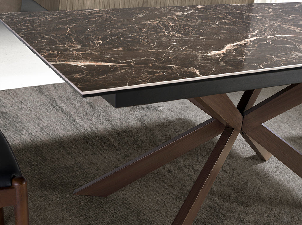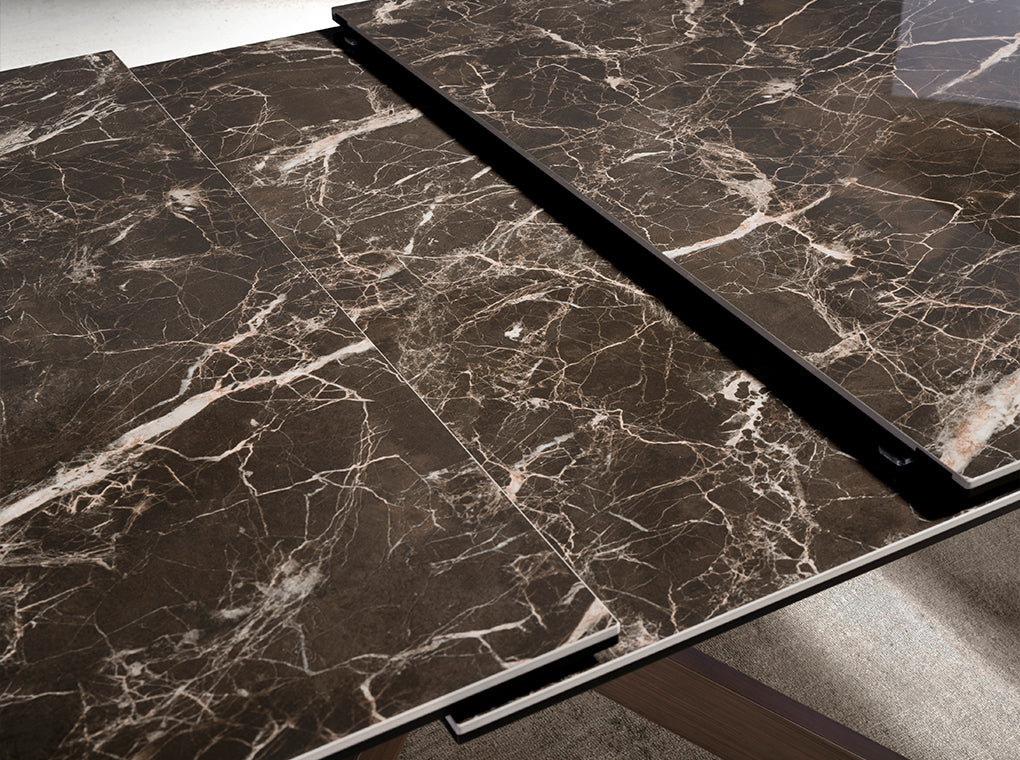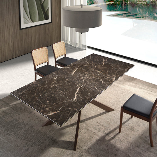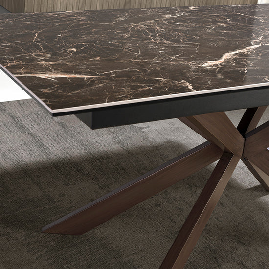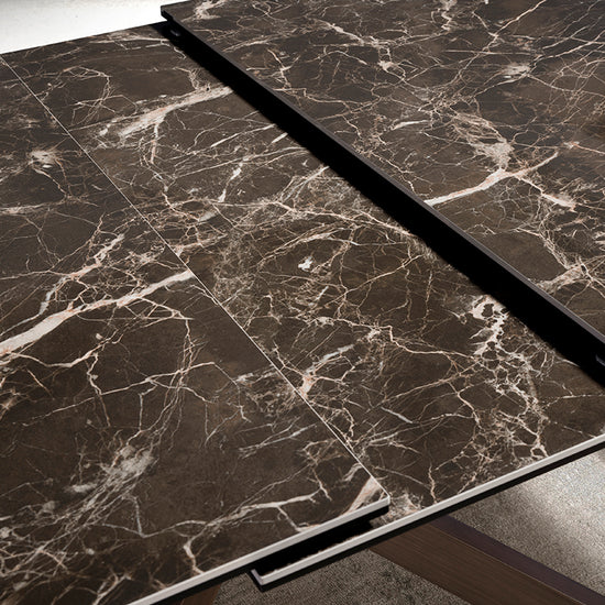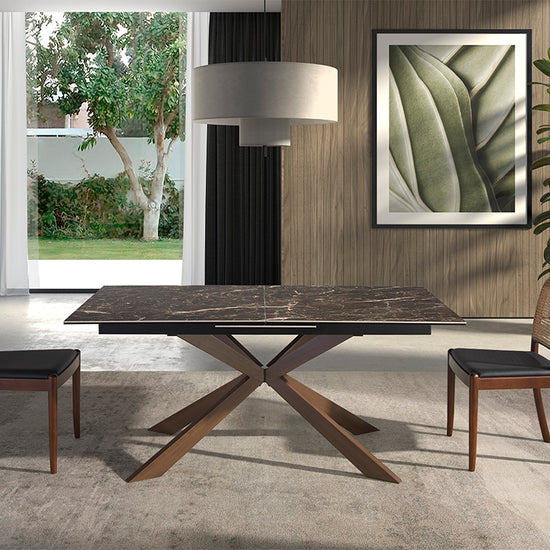 Mesa de comedor extensible rectangular de diseño moderno con tapa de mármol porcelánico marrón con vetas color crema y acabado brillo. Sus patas en acero inoxidable lacado efecto nogal y su adaptabilidad lo convierten en un mueble de uso diario totalmente funcional y versátil.