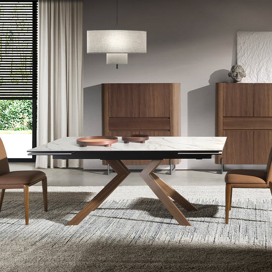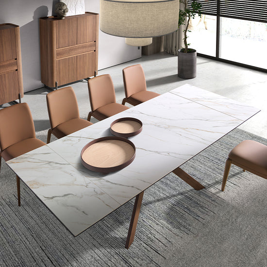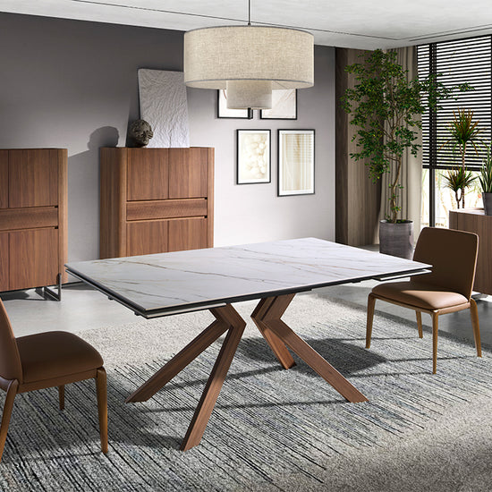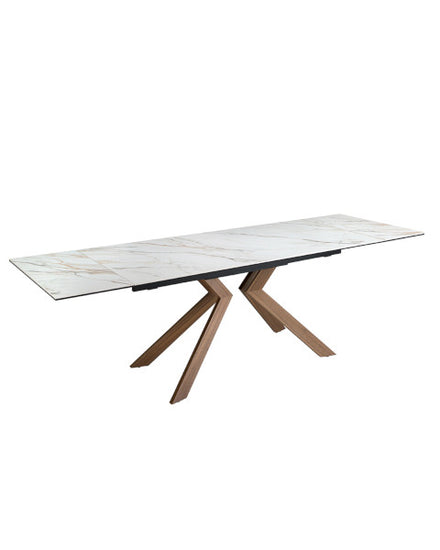 Mesa de comedor extensible rectangular de diseño moderno con tapa de mármol porcelánico blanco con vetas en tonos grises y marrones en acabado mate.