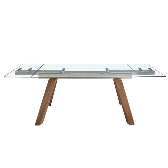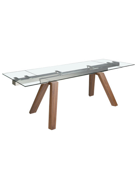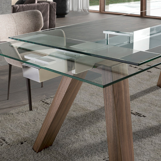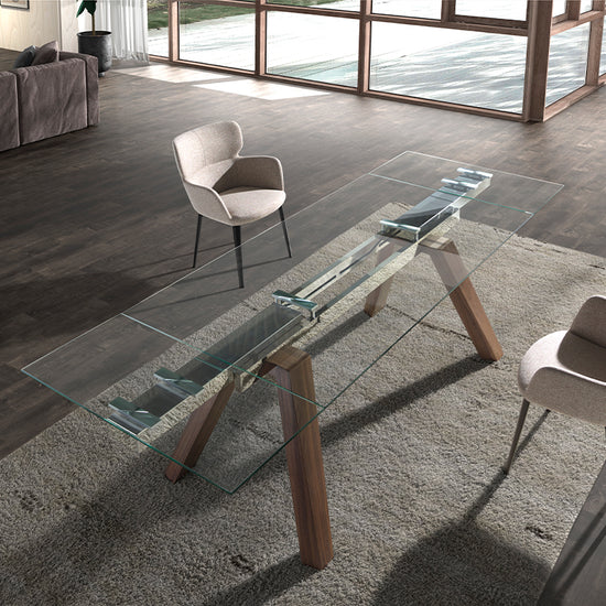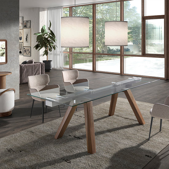 Mesa de comedor extensible rectangular de diseño moderno con tapa de cristal templado. Sus patas de madera chapada en nogal natural y su adaptabilidad lo convierten en un mueble totalmente funcional y versátil para el uso diario.