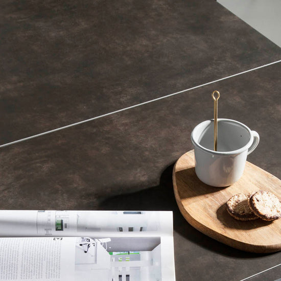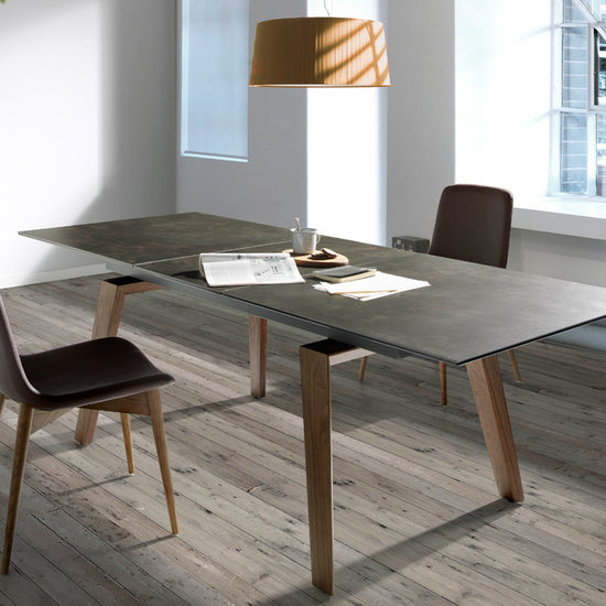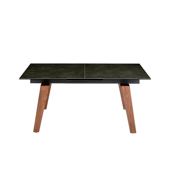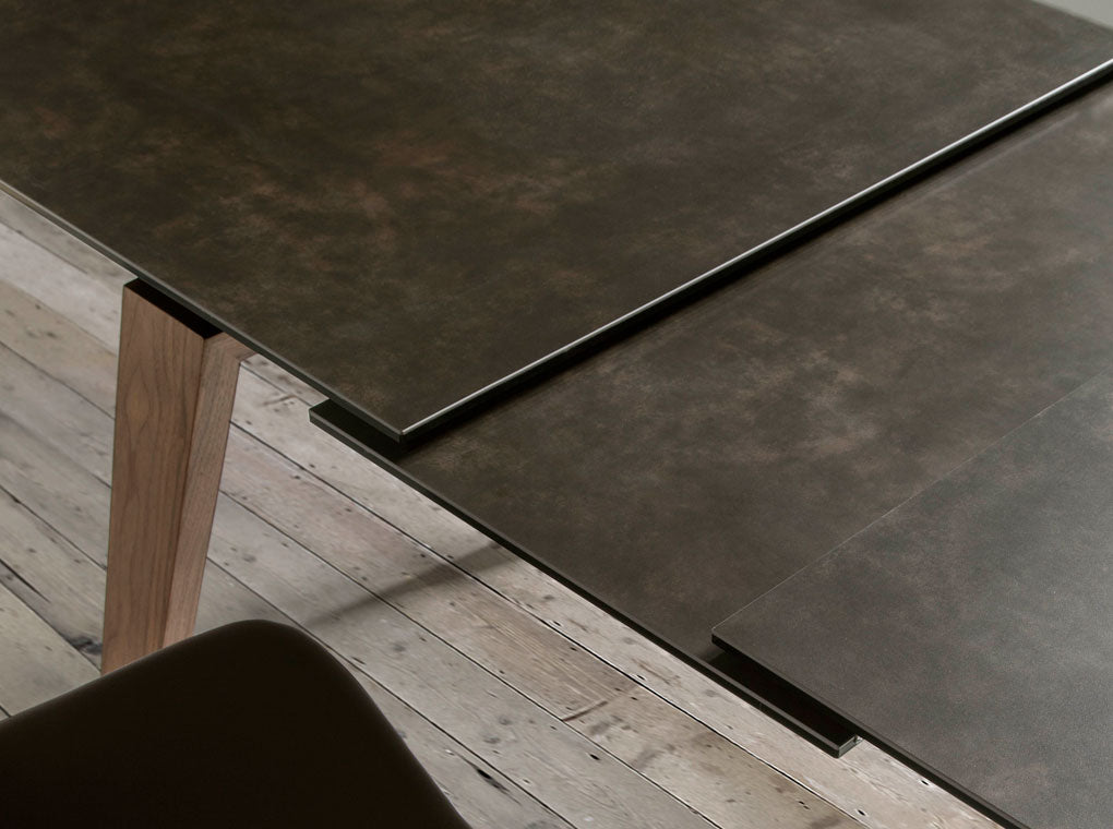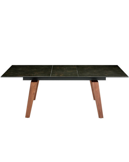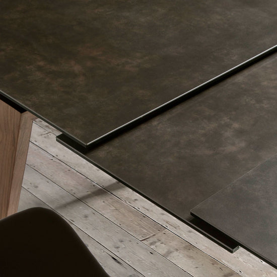 Mesa de comedor extensible rectangular de diseño moderno con tapa de mármol porcelánico negro efecto metal mate.