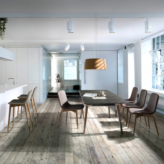 Sus patas de madera chapada en nogal natural y su adaptabilidad lo convierten en un mueble de uso diario totalmente funcional y versátil.