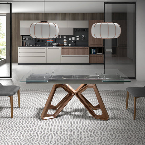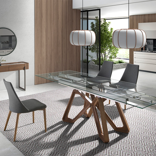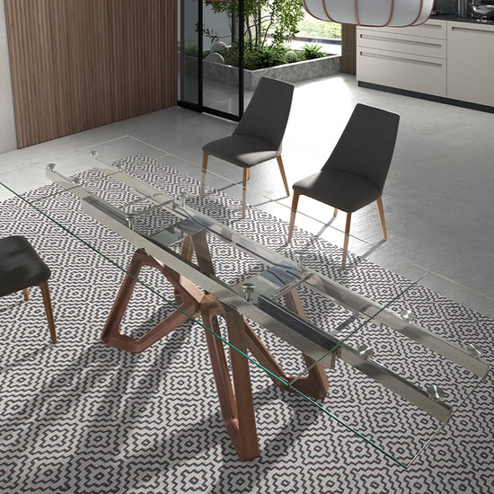 Mesa de comedor extensible rectangular de diseño moderno con tapa de cristal templado.