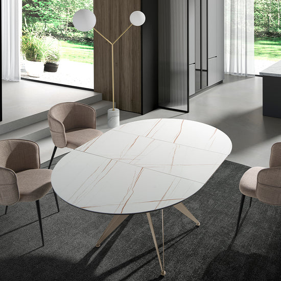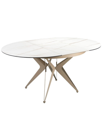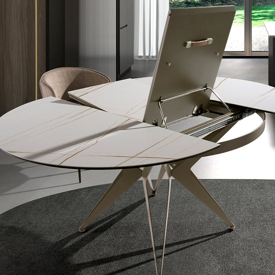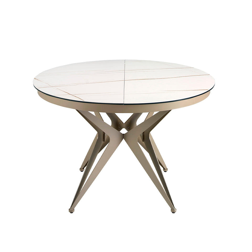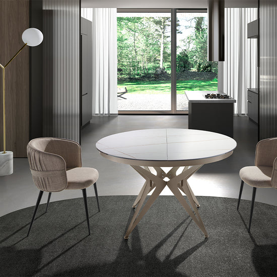 Mesa de comedor extensible redonda de diseño moderno con tapa de mármol porcelánico blanco con vetas marrones en acabado mate.