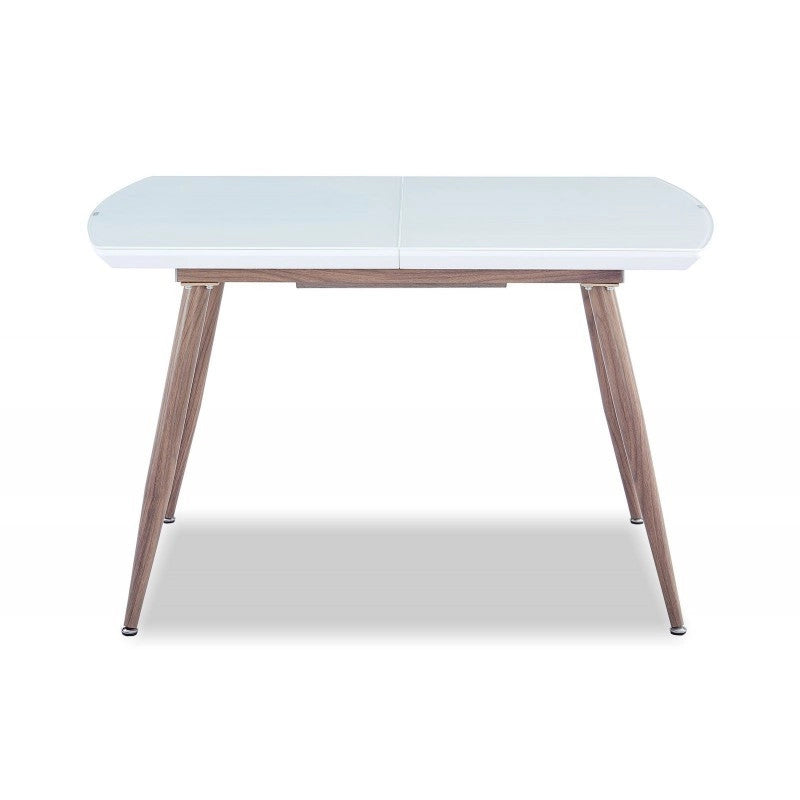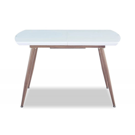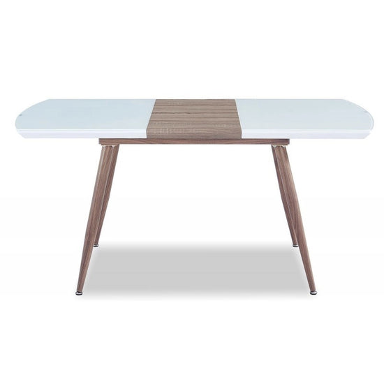 Mesa con tapa lacada en blanco y patas de acero reforzado con acabado de pintura epoxi imitando madera, de líneas suaves y elegantes que aportan naturalidad al espacio con tapa lacada en blanco y patas de acero reforzado con acabado de pintura epoxi imitando madera.