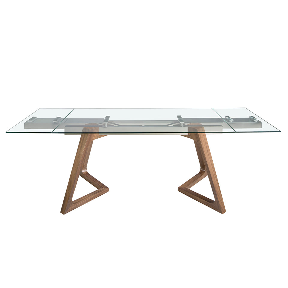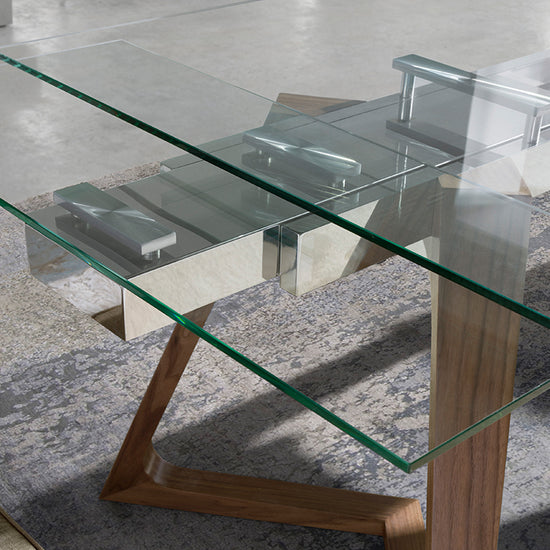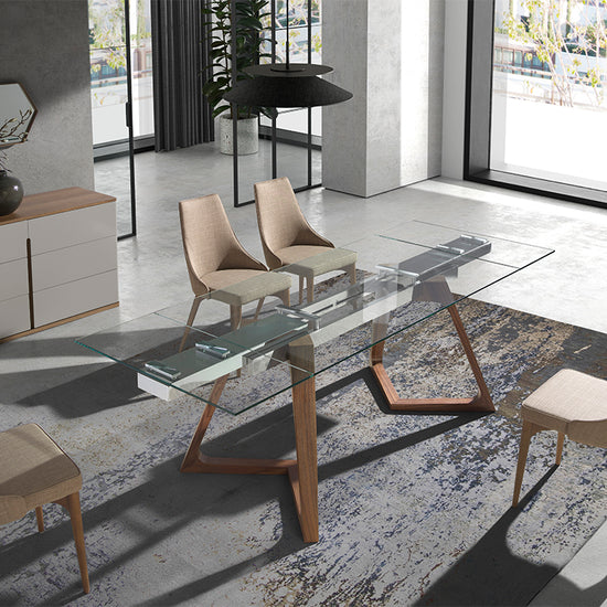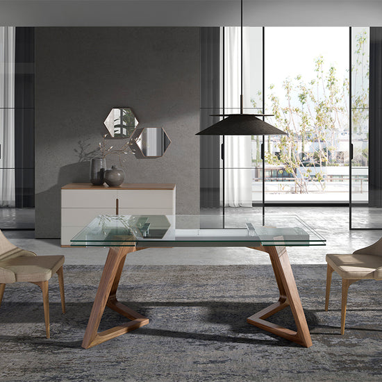 Mesa de comedor extensible rectangular de diseño moderno con tapa de cristal templado. Sus patas de madera chapada en nogal natural y su adaptabilidad lo convierten en un mueble totalmente funcional y versátil para el uso diario.