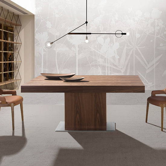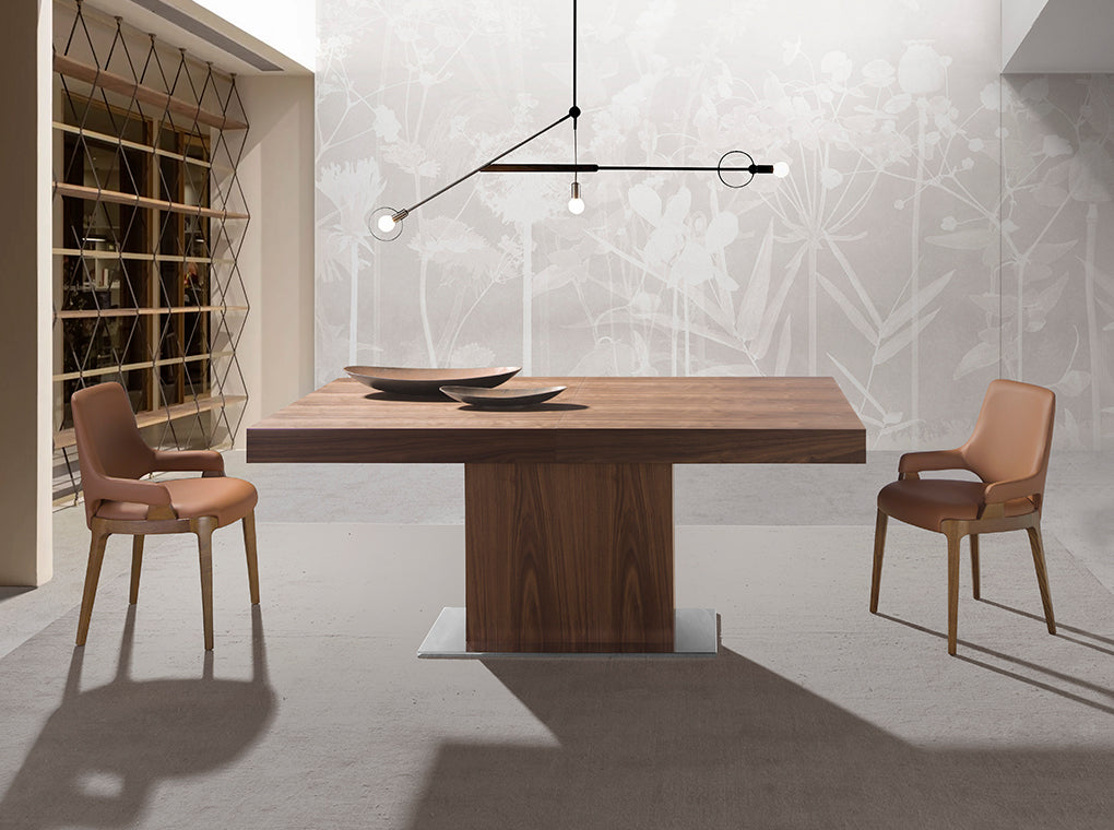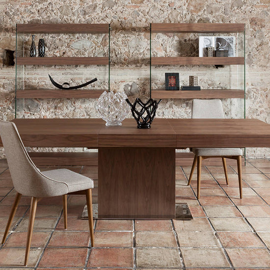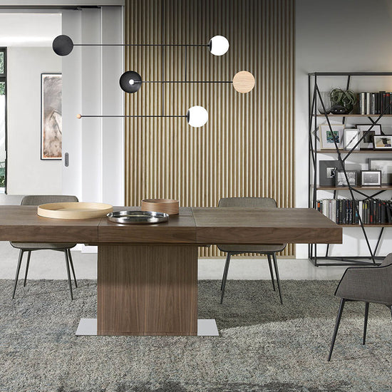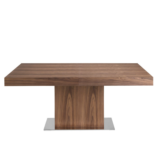 Mesa de comedor extensible rectangular de diseño moderno con tapa y estructura chapada en nogal natural.
