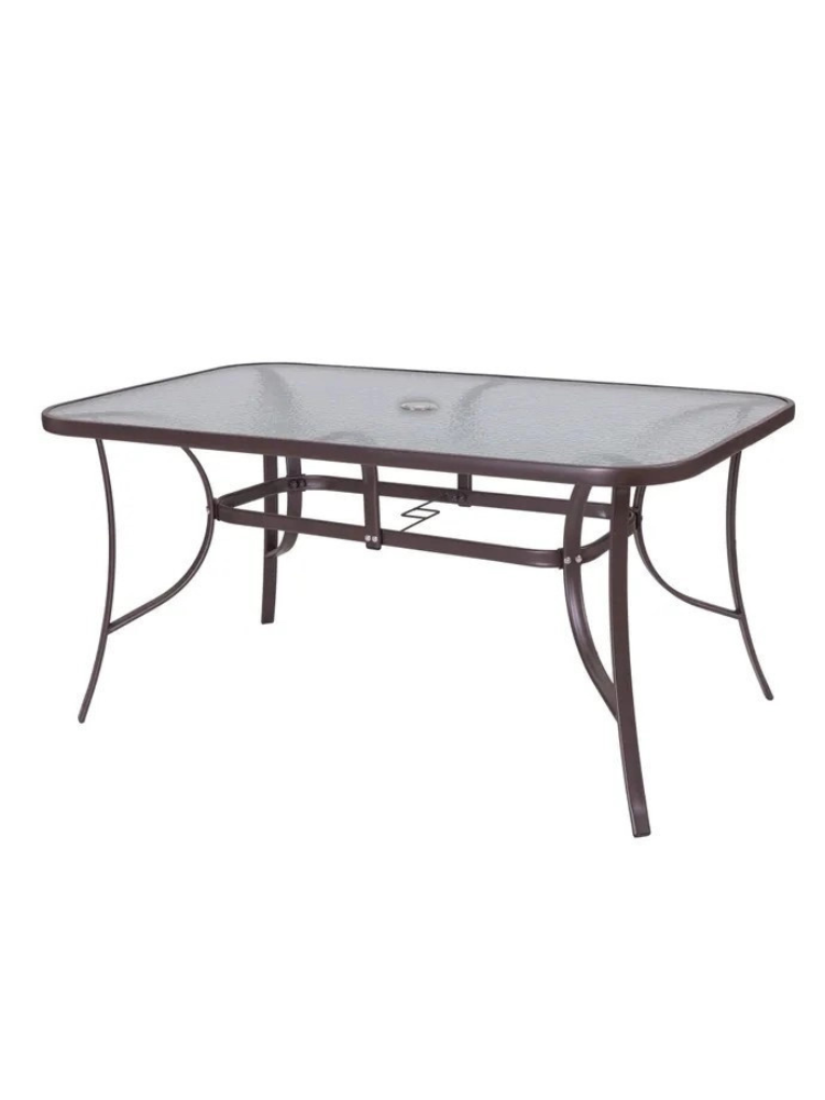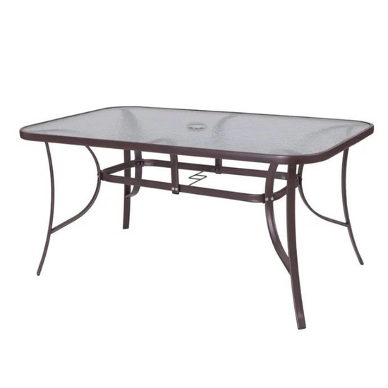 La parte superior de la mesa de comedor de exterior está hecha de vidrio templado de seguridad de 5 mm de espesor y tiene un acabado decorativo mate a base de agua, lo que le da un efecto opaco y semitranslúcido, ideal para muebles de exterior donde la acumulación deja caer fácilmente agua y polvo.