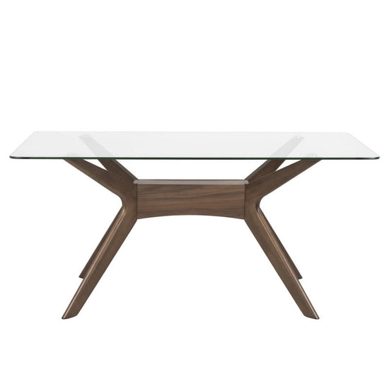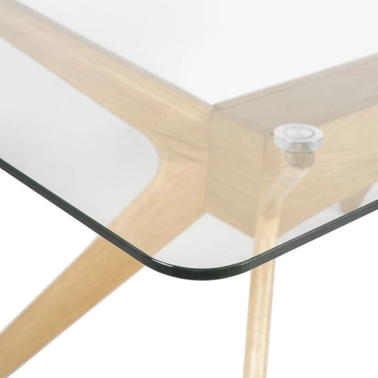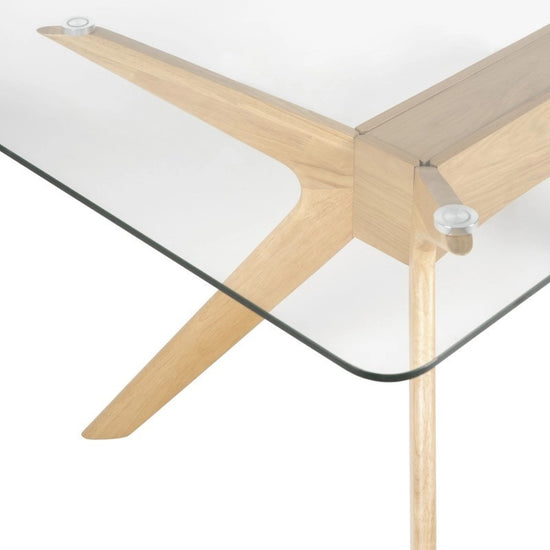 Mesa rectangular de cristal templado de 1 cm de medida 140x90cm con estructura y patas en madera de hevea acabado roble o nogal.