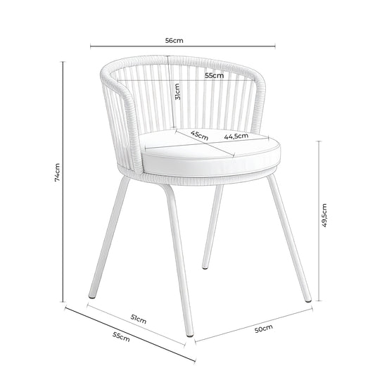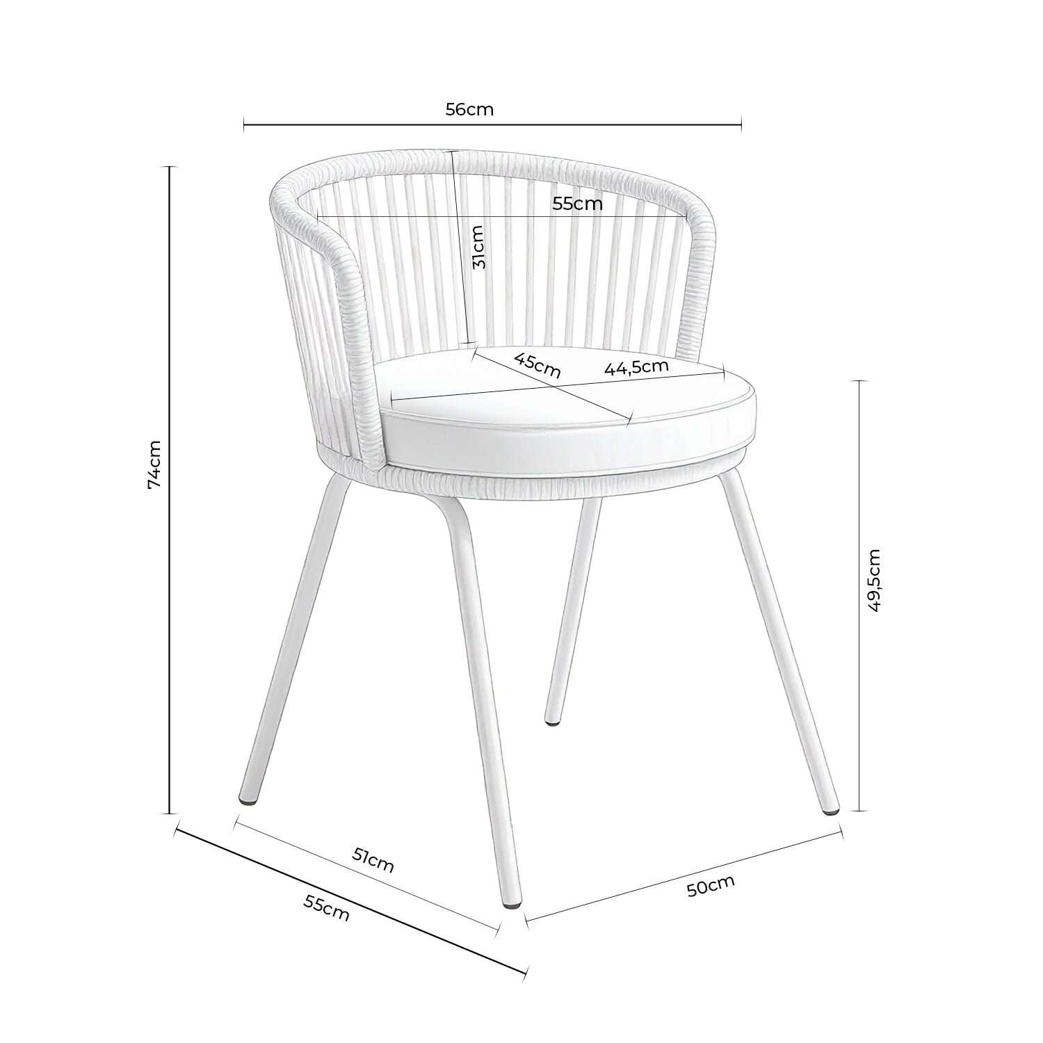 Las patas, de acero galvanizado tratado de alta resistencia para uso exterior, proporcionan una base sólida y estable, manteniendo un diseño elegante y minimalista. La estructura ergonómica garantiza una experiencia de asiento cómoda, ideal tanto para largas comidas después de la cena como para momentos relajantes al aire libre.