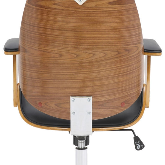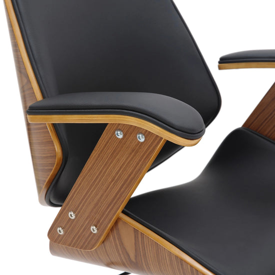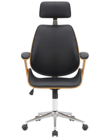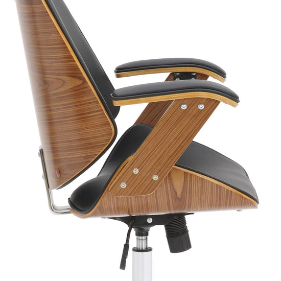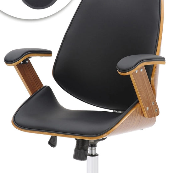 La silla de oficina Chicago promete una combinación particularmente elegante de cuero sintético moderno y un elegante marco de madera con chapa de nogal.