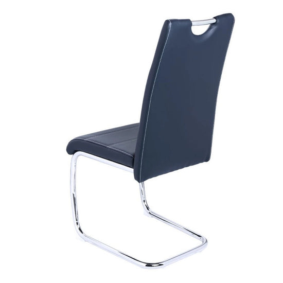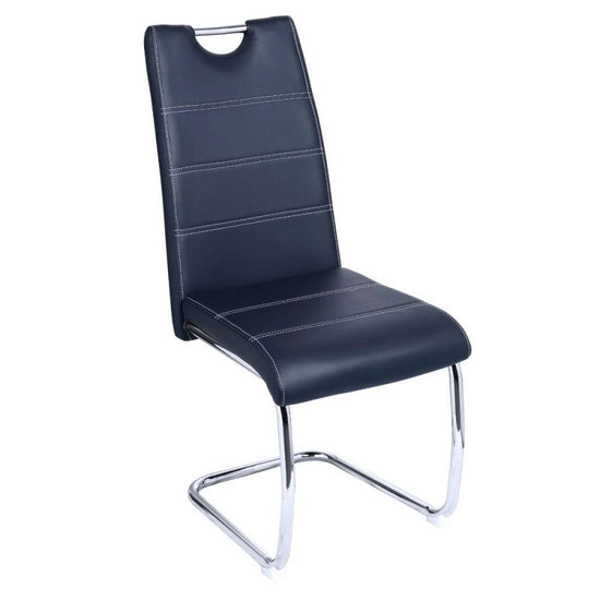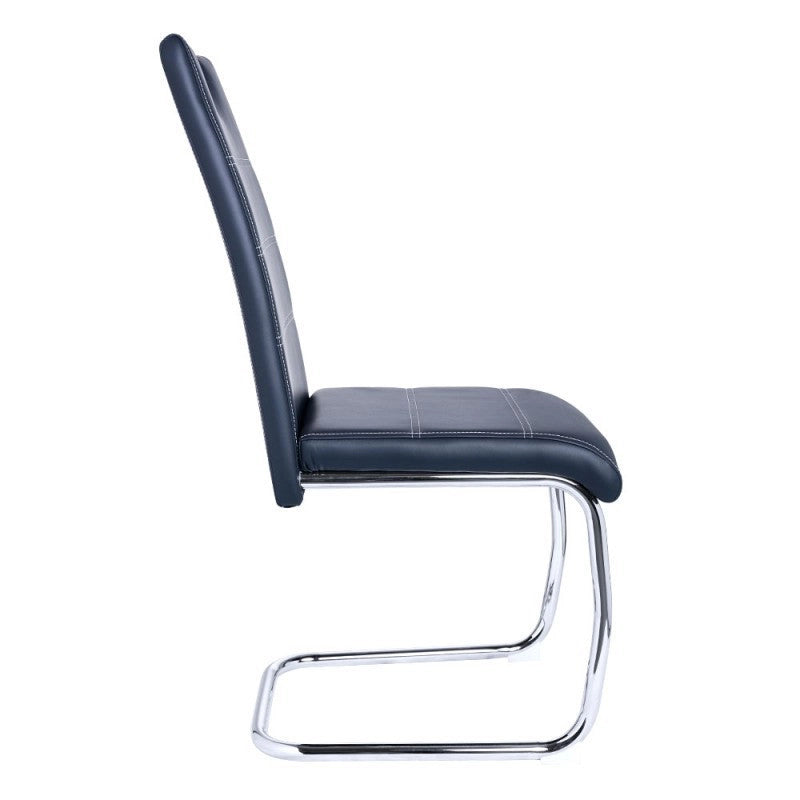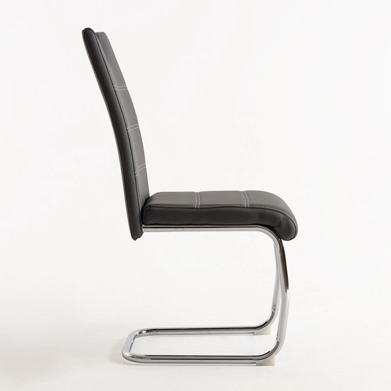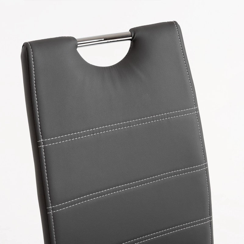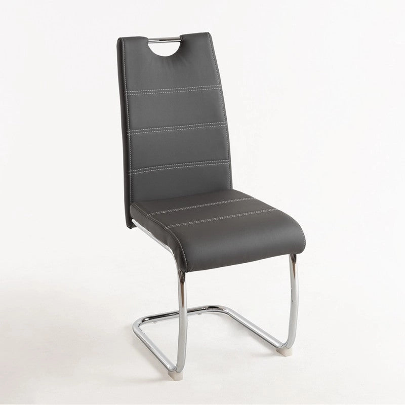 Esta silla está basada en un tubo de metal con acabado cromado, las zonas de contacto están revestidas de polipiel y los asientos y respaldo son de espuma de poliuretano, lo que le confiere un excelente confort y un diseño moderno y elegante.