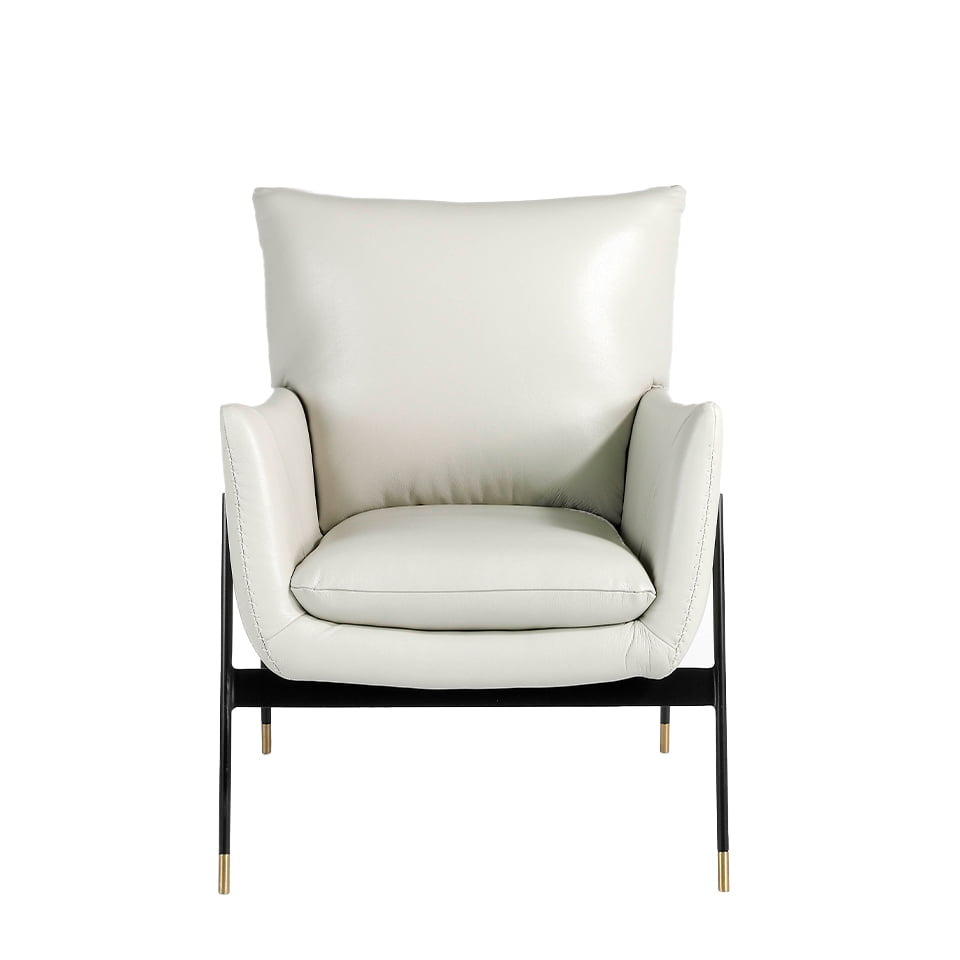 Sillón de diseño moderno con brazos, asiento y respaldo tapizados en piel vacuno color gris perla. Gracias tanto a los detalles de acero inoxidable cromado dorado como a las patas de acero inoxidable negro, este sillón es la combinación perfecta entre diseño y comodidad.