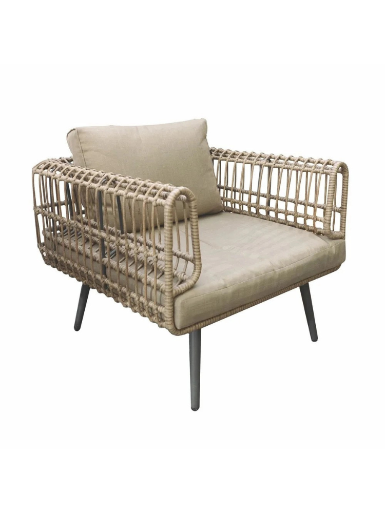 Sofá de exterior Ariki, exclusivo y original, de diseño moderno, con estructura de acero con acabado epoxi negro, mimbre tejido y cojines en color Taupe.
