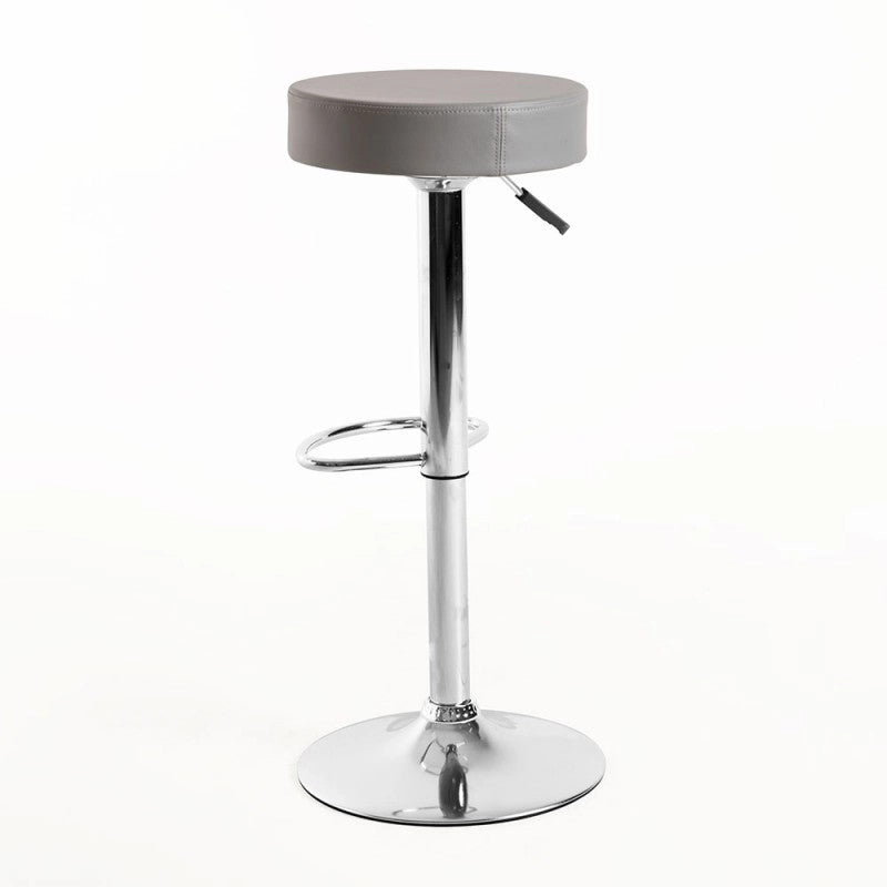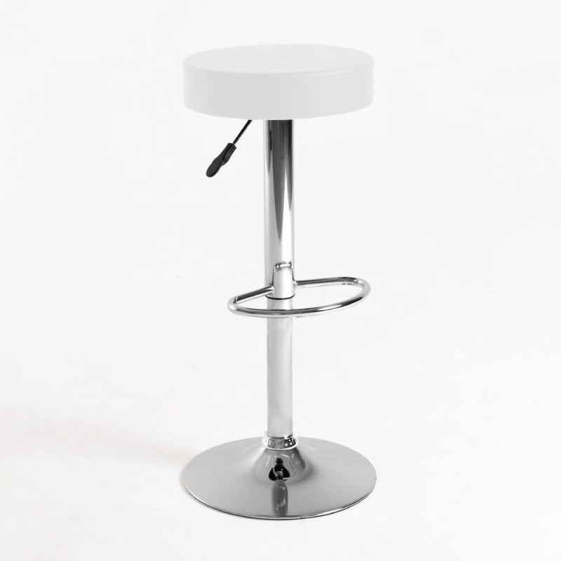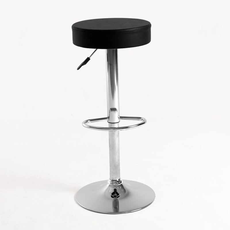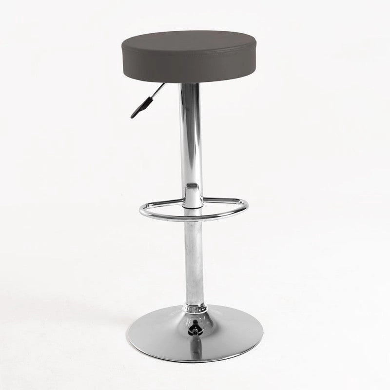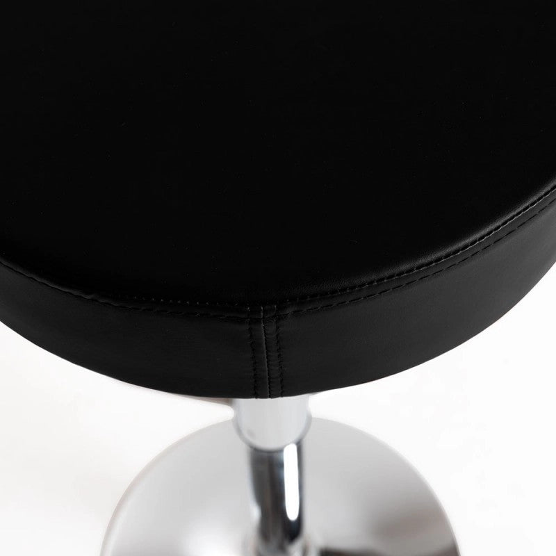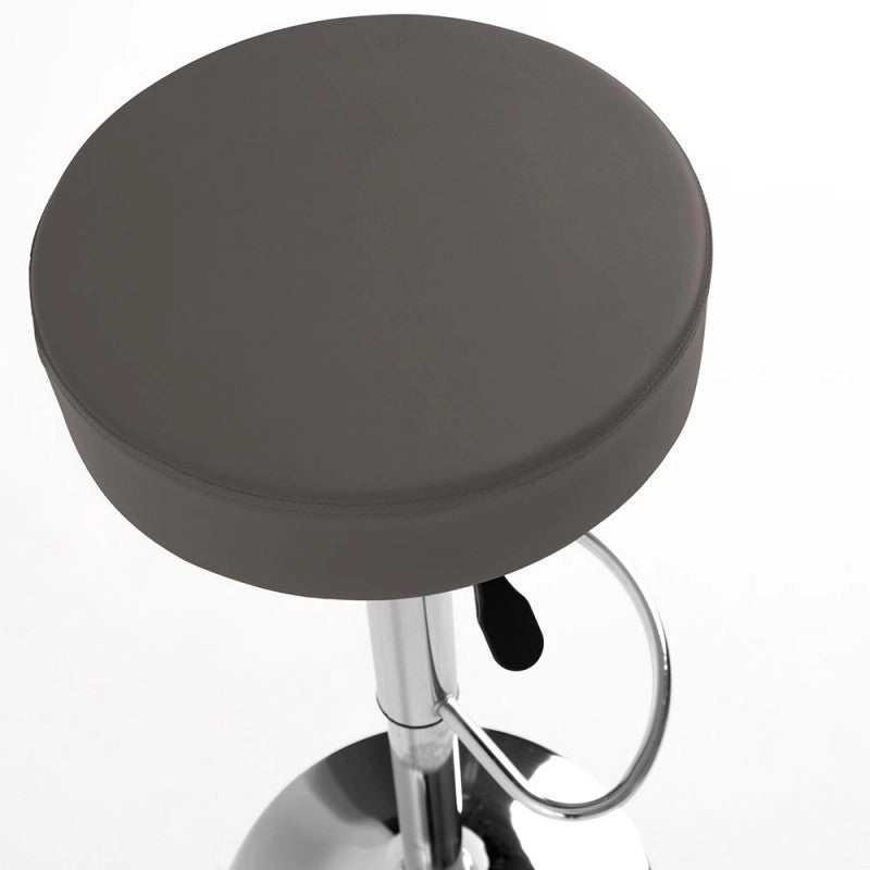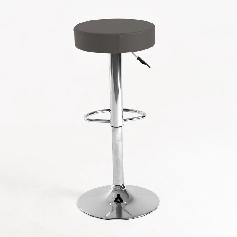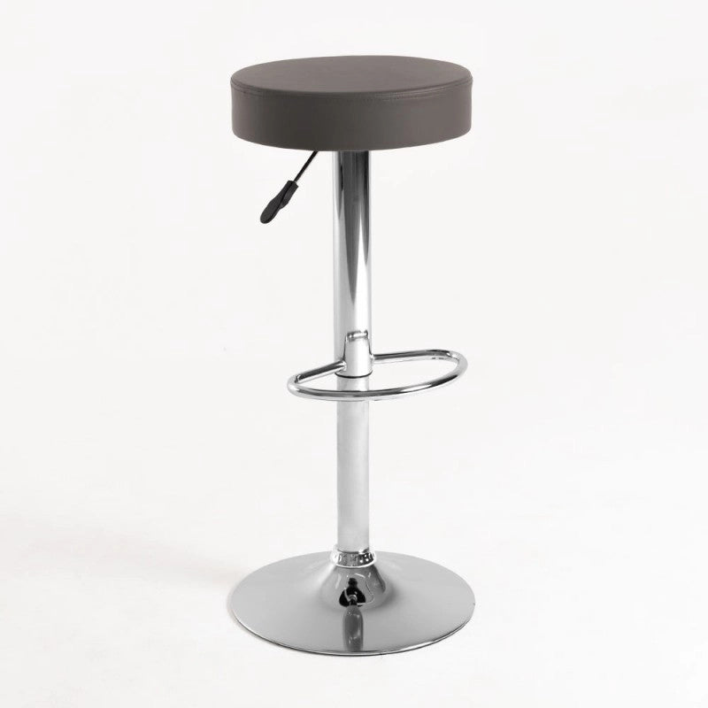 El taburete alto Oulu ofrece un diseño minimalista de estilo industrial con un cómodo asiento y una base de metal cromado muy práctico, ya que incluye reposapiés, es giratorio y regulable en altura mediante sistema hidráulico de gas.