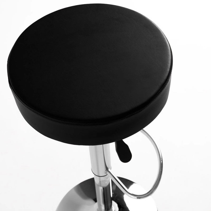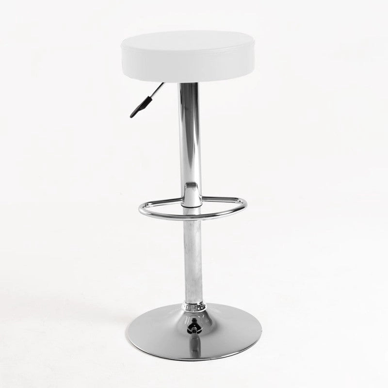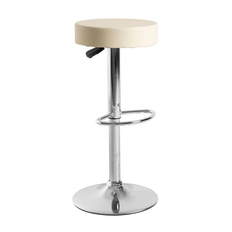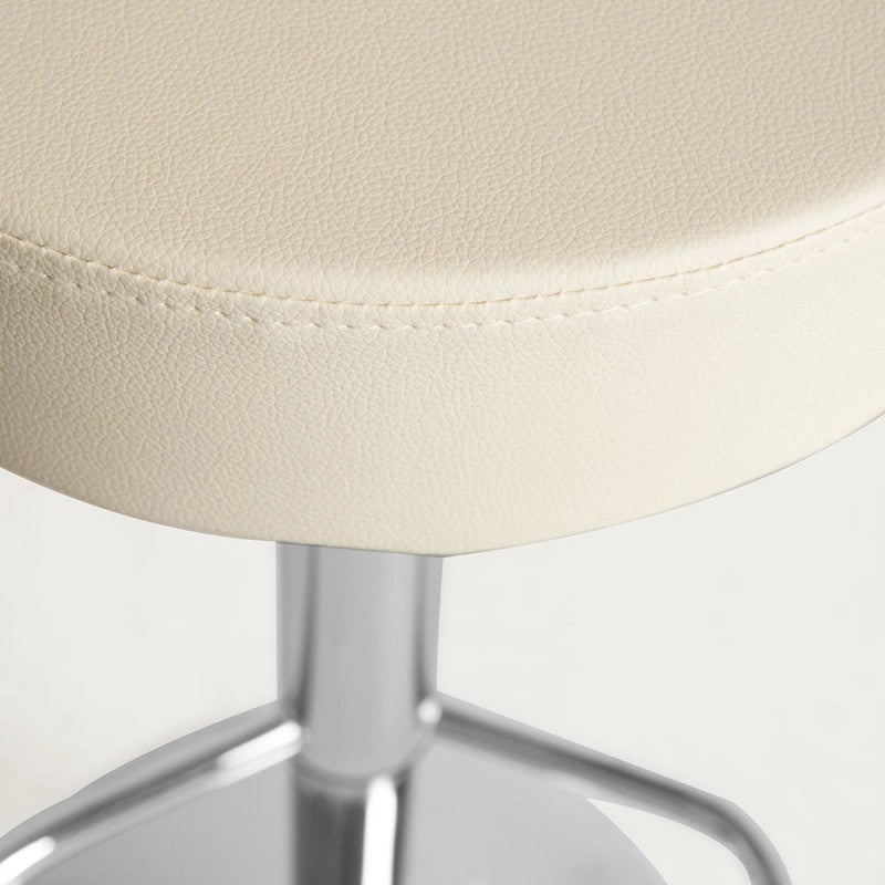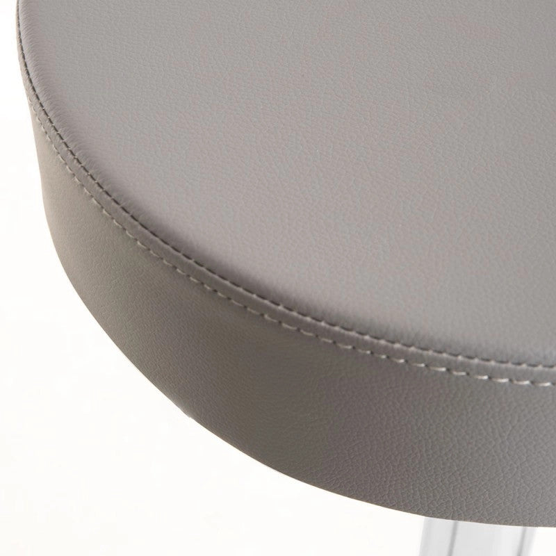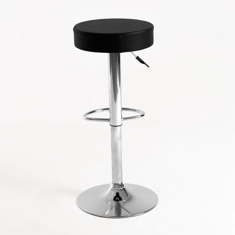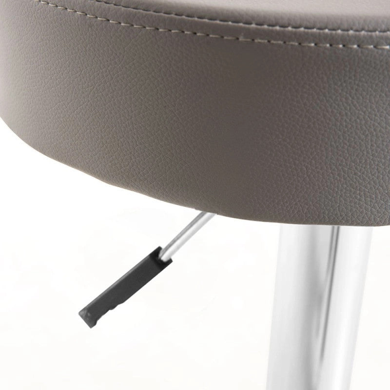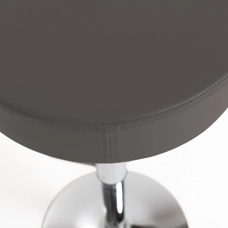 El taburete alto Oulu ofrece un diseño minimalista de estilo industrial con un cómodo asiento y una base de metal cromado muy práctico, ya que incluye reposapiés, es giratorio y regulable en altura mediante sistema hidráulico de gas.
