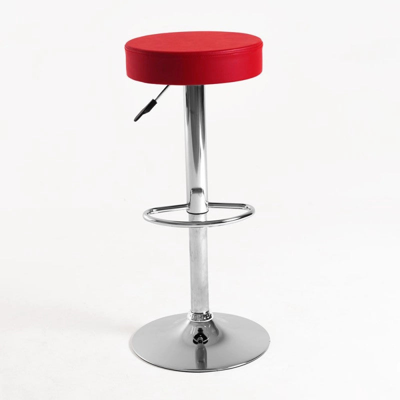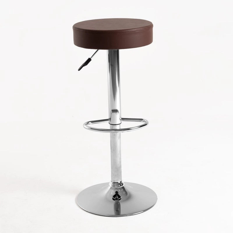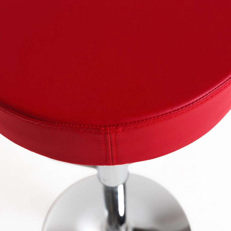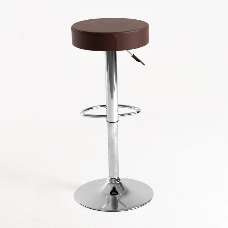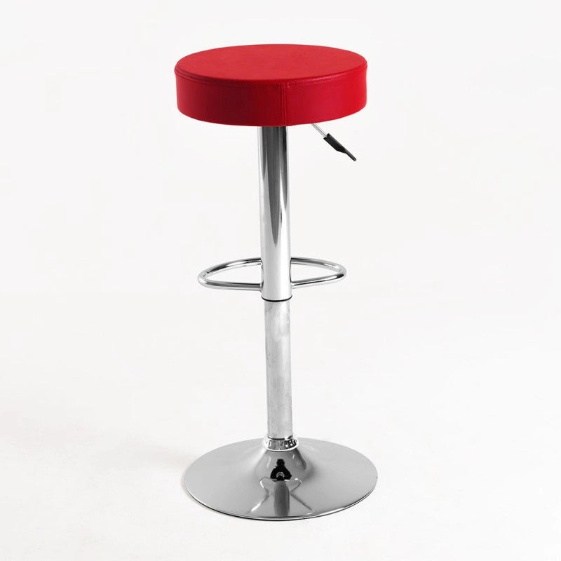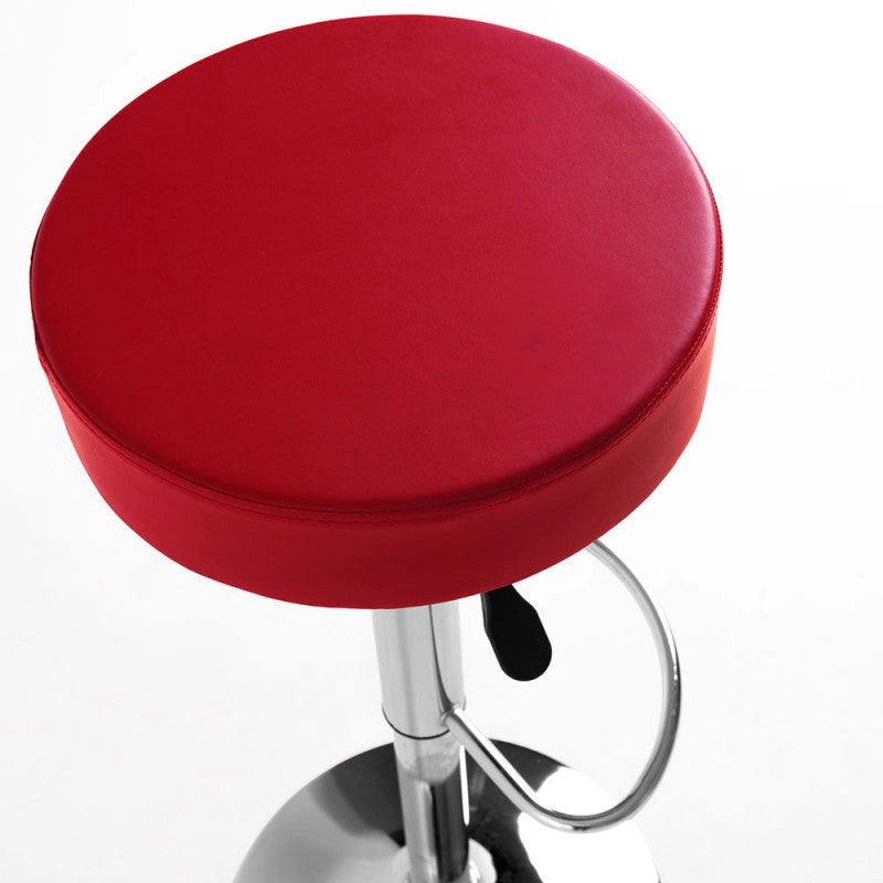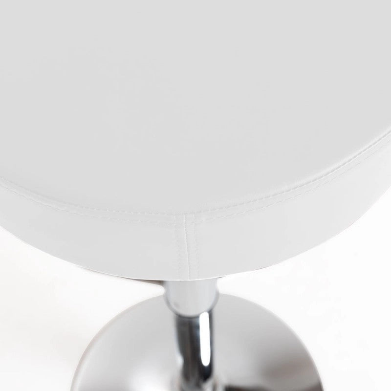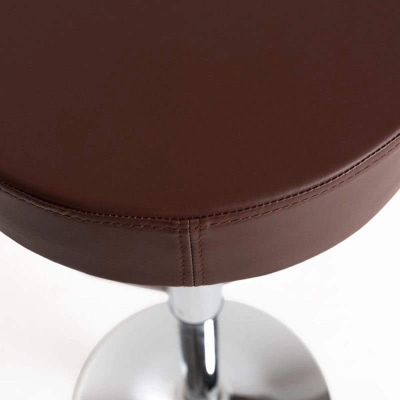 El taburete alto Oulu ofrece un diseño minimalista de estilo industrial con un cómodo asiento y una base de metal cromado muy práctico, ya que incluye reposapiés, es giratorio y regulable en altura mediante sistema hidráulico de gas.