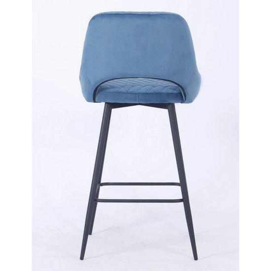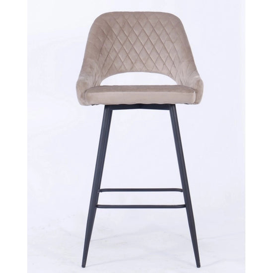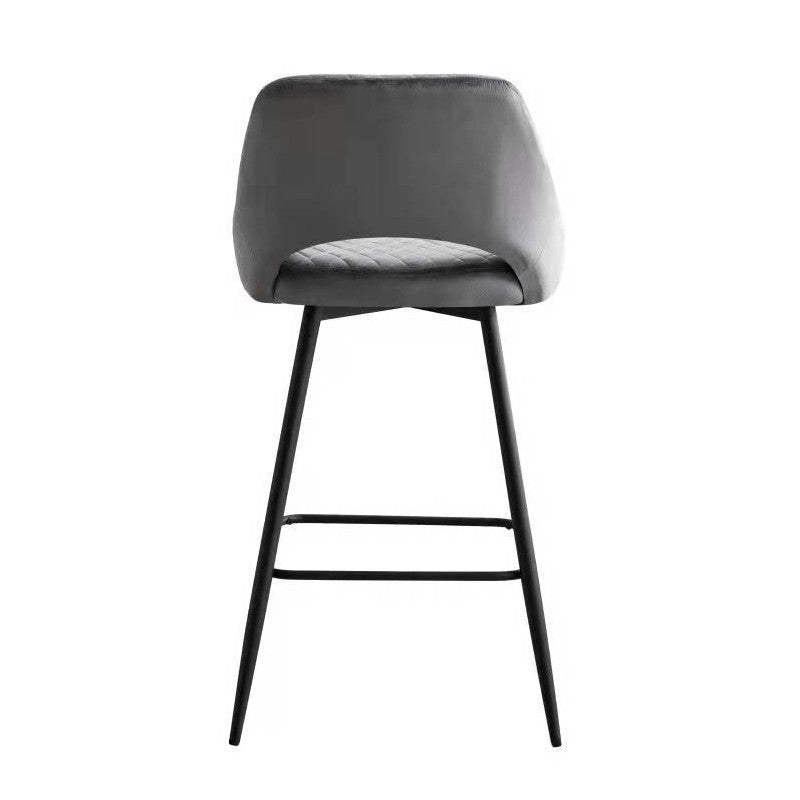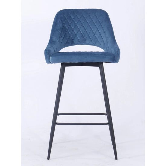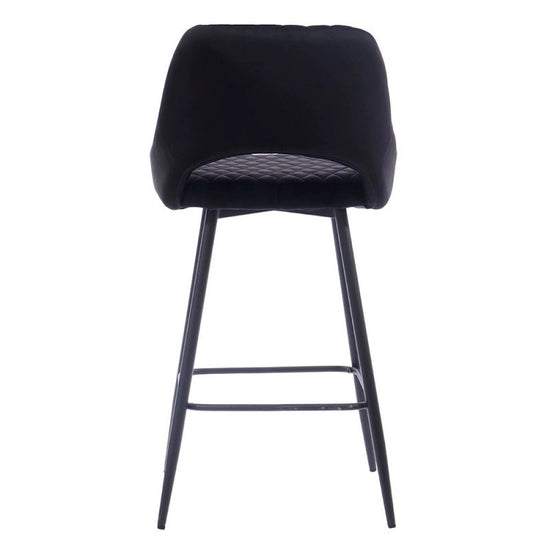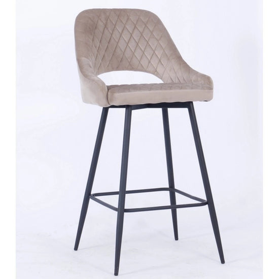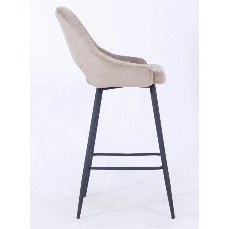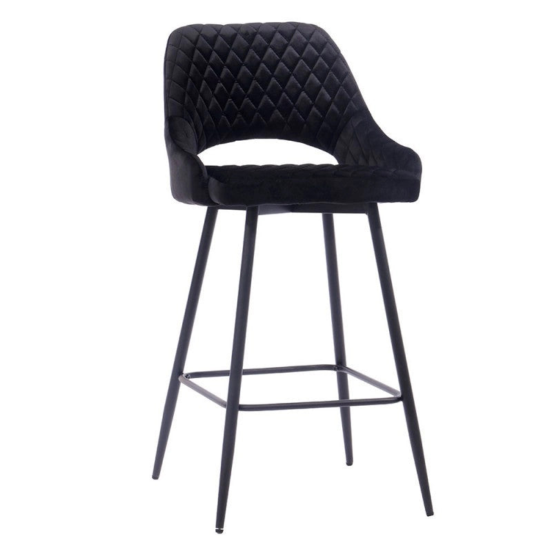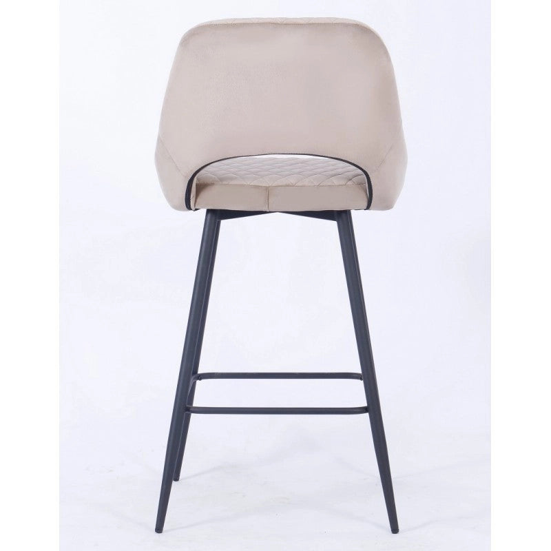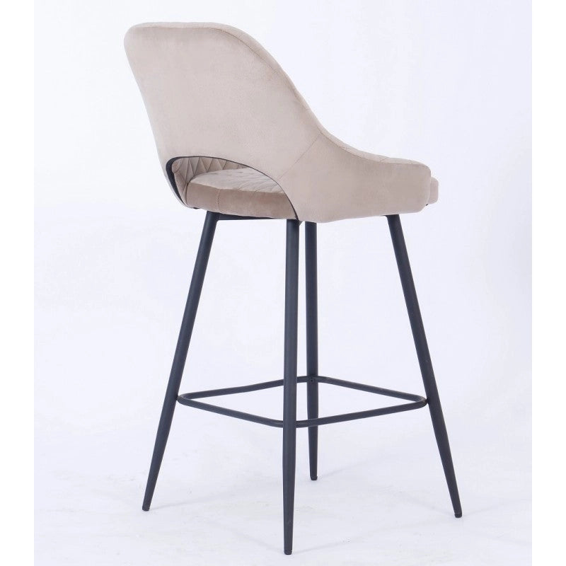 El taburete de bar está tapizado en terciopelo y el respaldo tiene una forma ligeramente curvada para mayor comodidad, con una apertura entre el respaldo y el asiento.