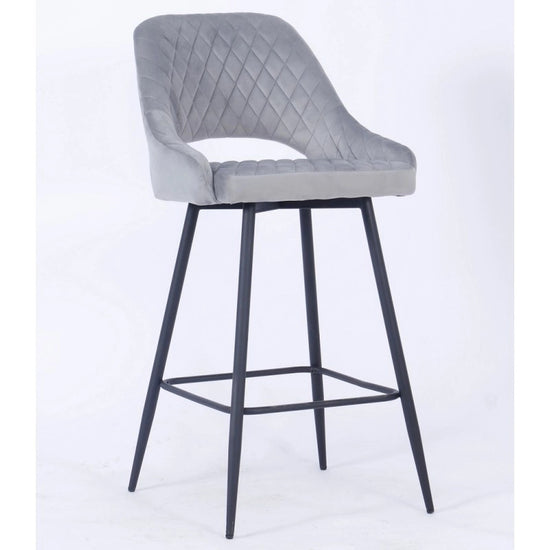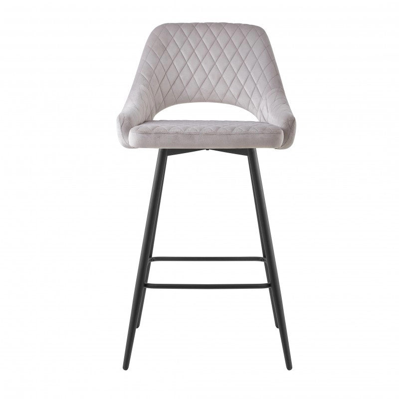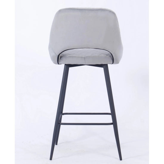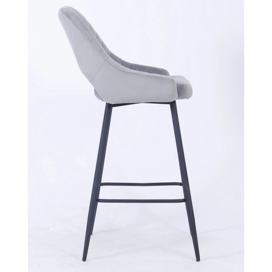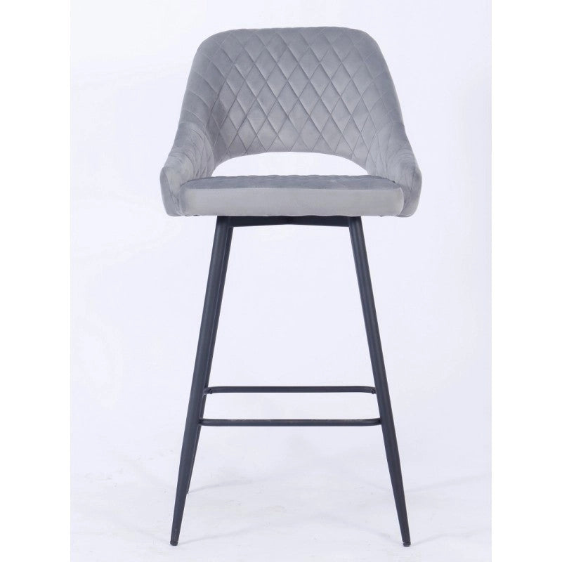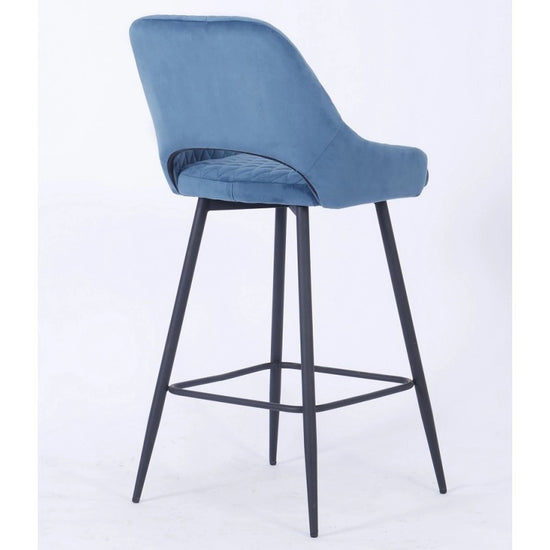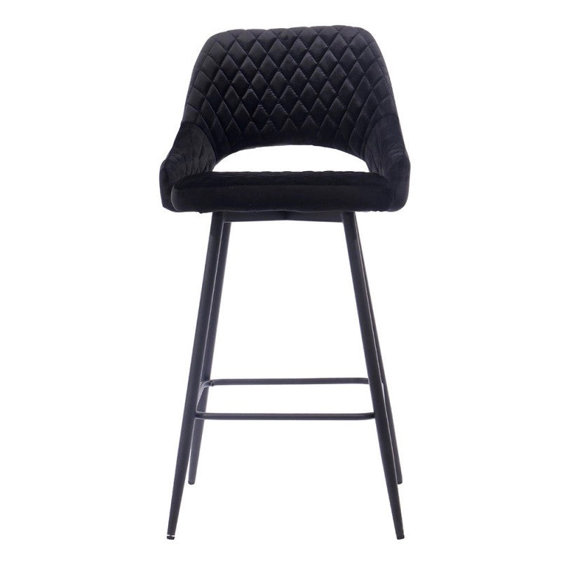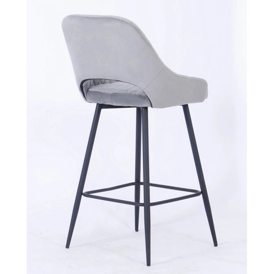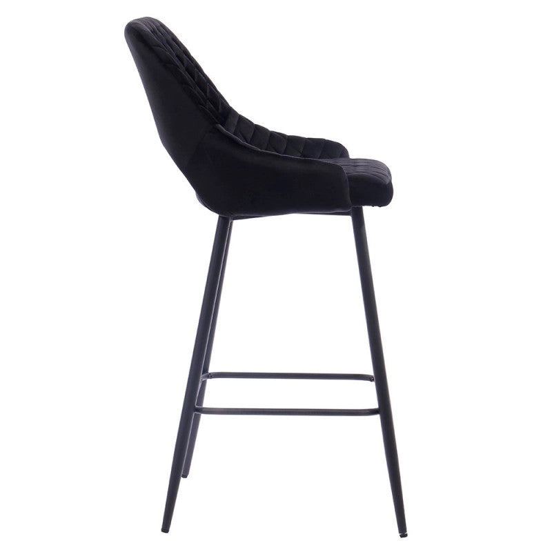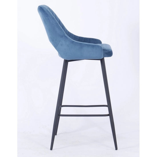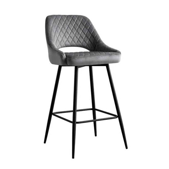 El taburete de bar está tapizado en terciopelo y el respaldo tiene una forma ligeramente curvada para mayor comodidad, con una apertura entre el respaldo y el asiento.