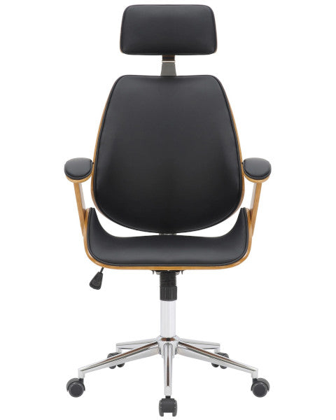A Cadeira Escritório Chicago promete uma combinação particularmente elegante em pele sintética moderna e uma elegante estrutura de madeira com folheado de nogueira.